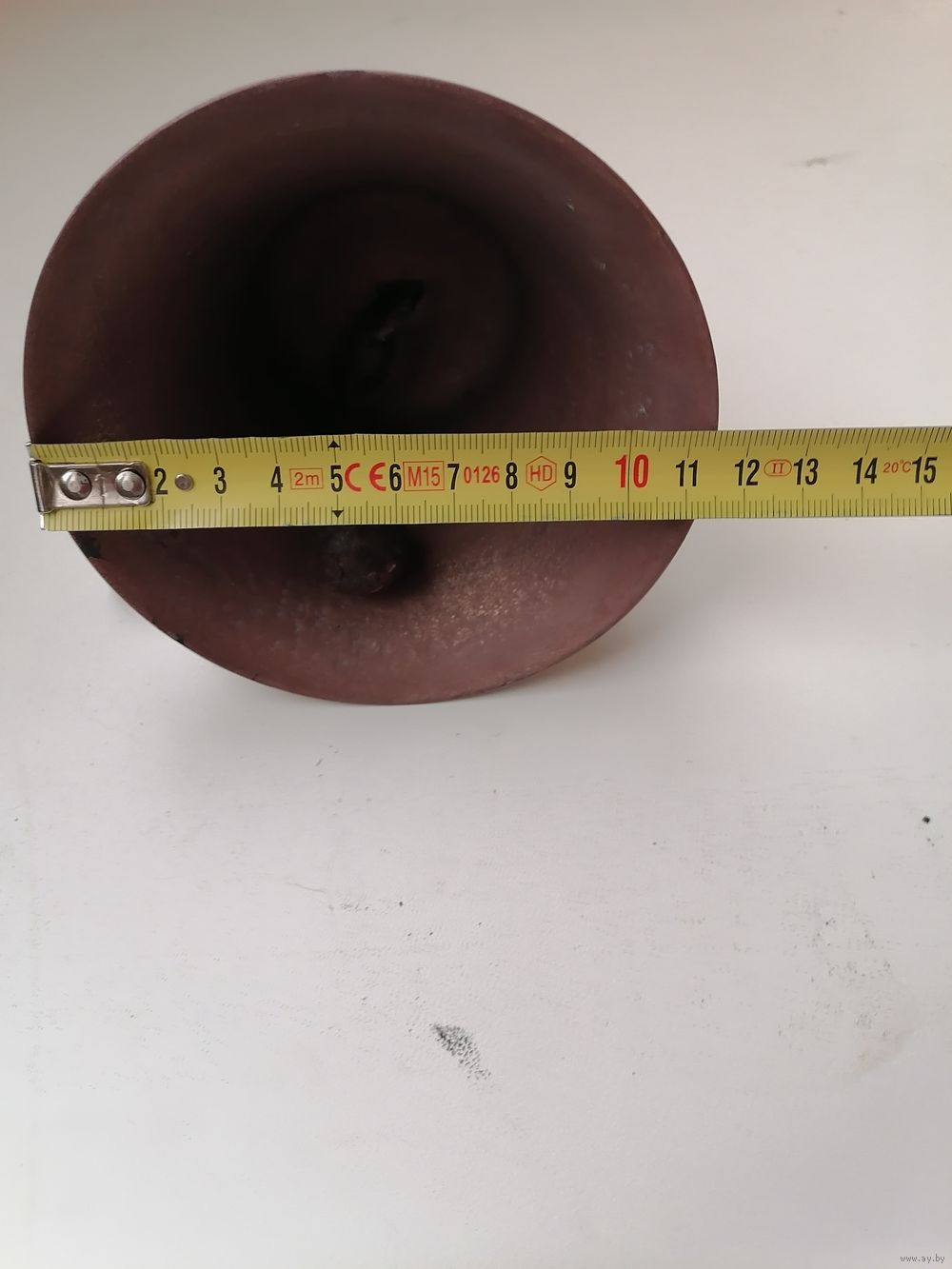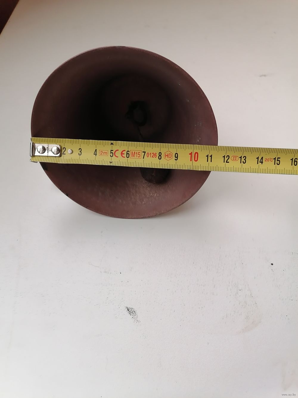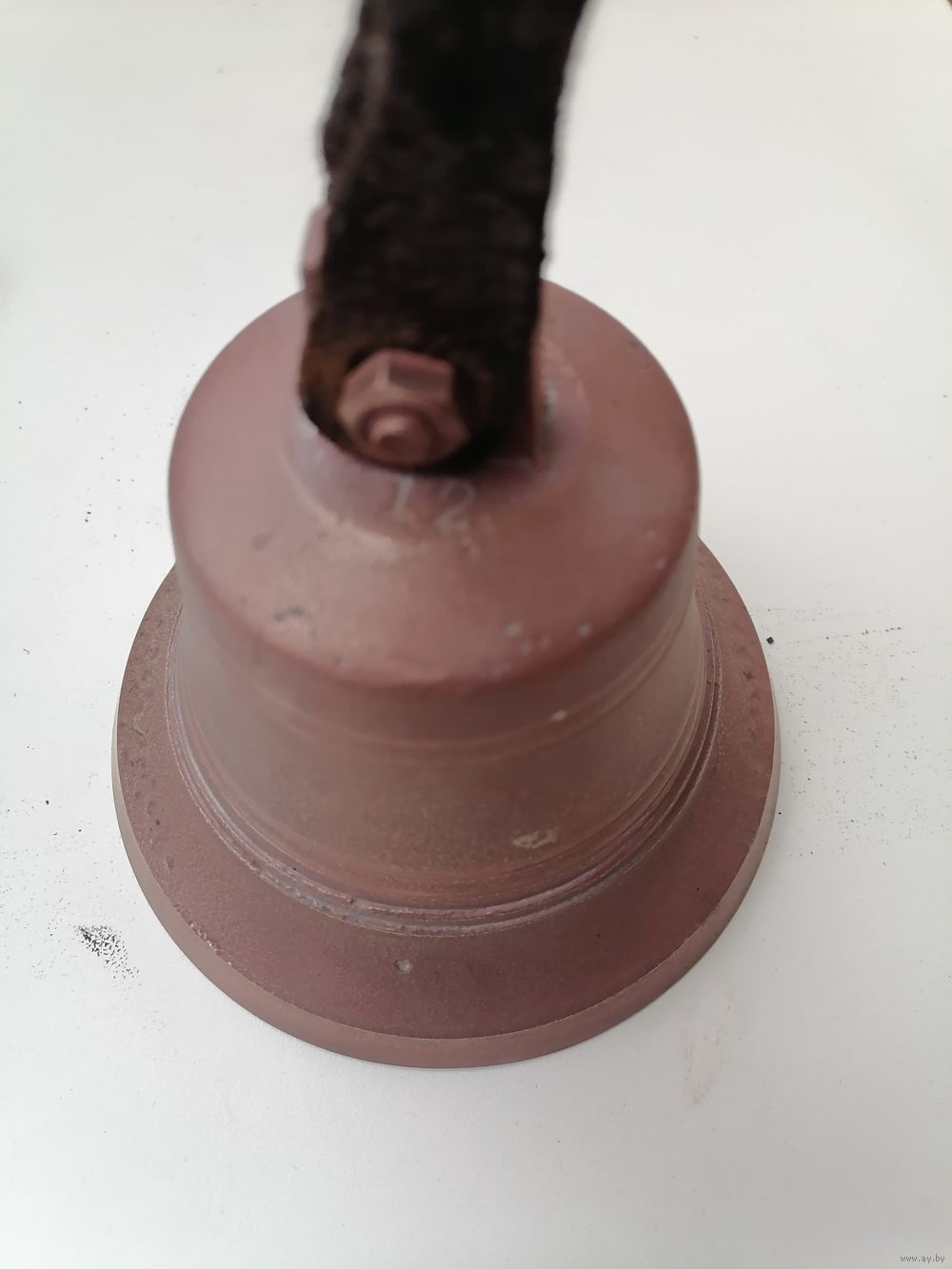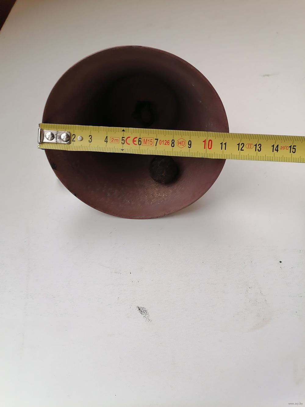 Добрый день. Колокол из меди , очистил ,но не полировал . Язычок ржавый ,но свою функцию выполняет. Звонкий . На верху присутствует цифра 12 . Привезен из Исландии.
