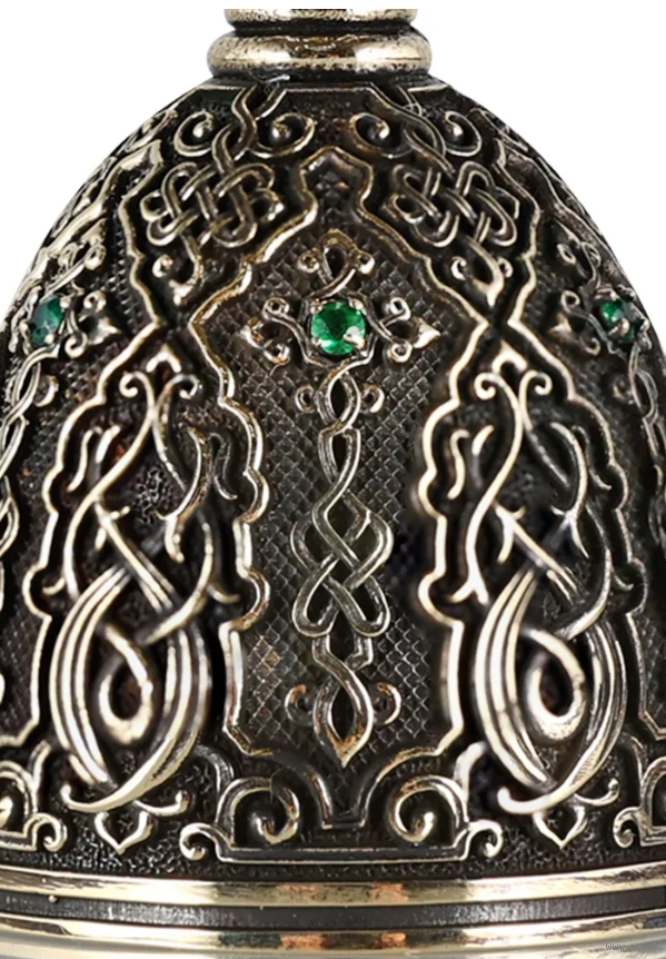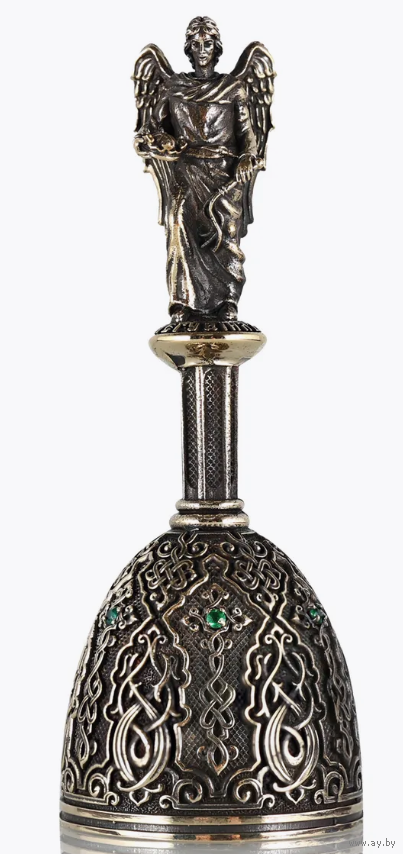 Барельеф украшен классическими православными узорами. Обработка - полировка, оксидирование (художественное патинирование). Инкрустация ювелирными вставками - фианитами. Негромкий, приятный звон.