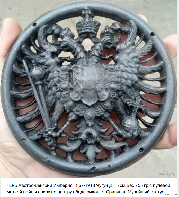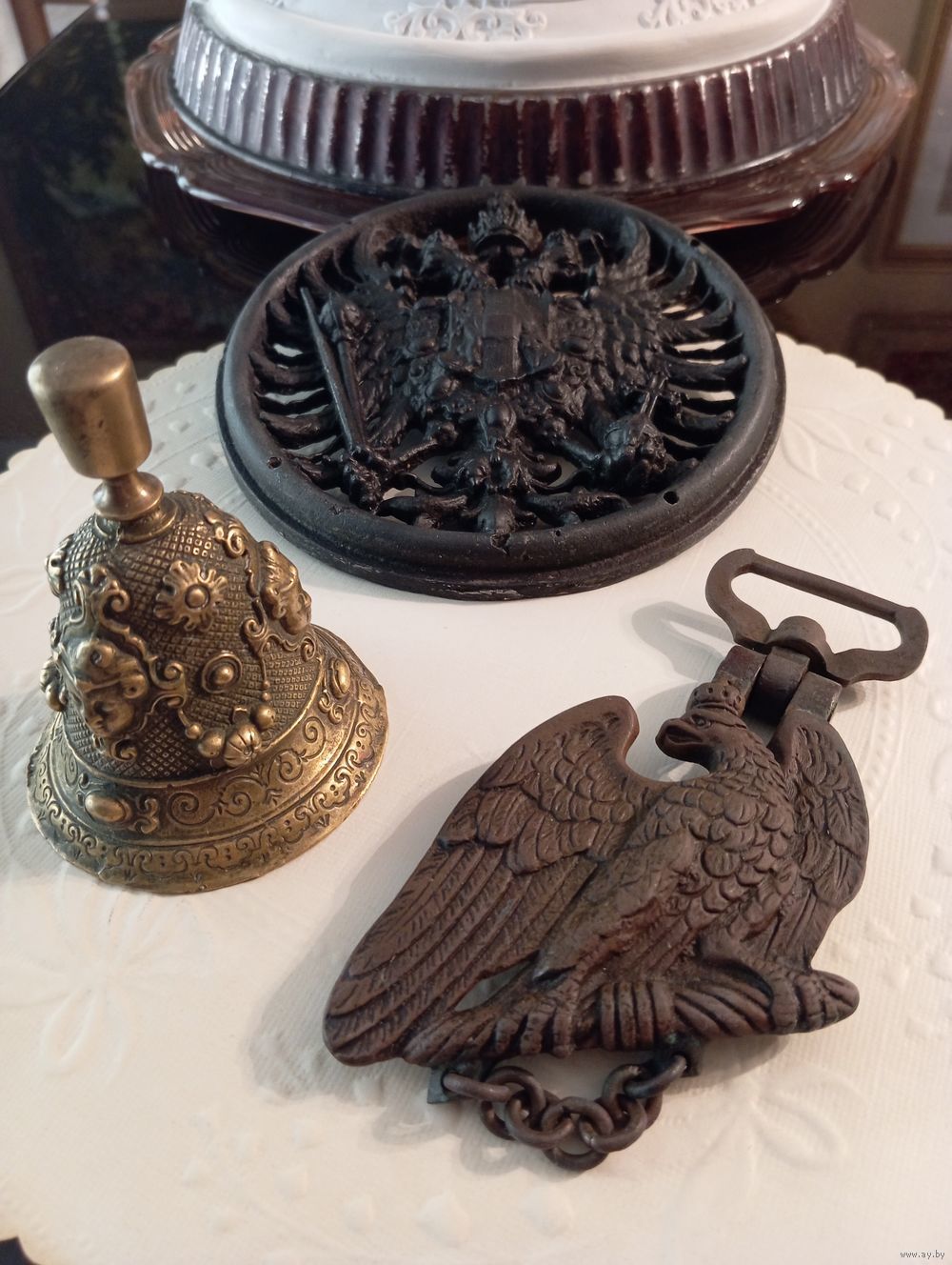 1. Колокольчик-Вызывной 18-19 век Бронза 320 гр 7.5х9 см 2. Герб-Накладка Австро-Венгрия Империя Чугун Д 15 см 750 гр 1867-1918 г с меткой войны на ободе снизу по центру характерный рикошет 3. Орёл-Подвес с цепью для малого барабана и стакана под флаг Гвардии Наполеона-Бонапарта I Бронза 189 гр 13.5 х 7.5 см 1804-1815 г 4. Рама Франция Барокко 19 век 3.3 кг 67х44 см 5. Подсвечники от рояля Бронза Пара 19 век 6. Сумка театральная Германия 1950-ые 7. Домик коллекционный Германия 1950-ые . Можно в розницу - предлагайте цену . Всё Белпочтой или самовывоз .