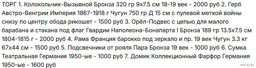 1. Колокольчик-Вызывной 18-19 век Бронза 320 гр 7.5х9 см 2. Герб-Накладка Австро-Венгрия Империя Чугун Д 15 см 750 гр 1867-1918 г с меткой войны на ободе снизу по центру характерный рикошет 3. Орёл-Подвес с цепью для малого барабана и стакана под флаг Гвардии Наполеона-Бонапарта I Бронза 189 гр 13.5 х 7.5 см 1804-1815 г 4. Рама Франция Барокко 19 век 3.3 кг 67х44 см 5. Подсвечники от рояля Бронза Пара 19 век 6. Сумка театральная Германия 1950-ые 7. Домик коллекционный Германия 1950-ые . Можно в розницу - цены с торгом на последнем фото смотрите . Всё Белпочтой или самовывоз .