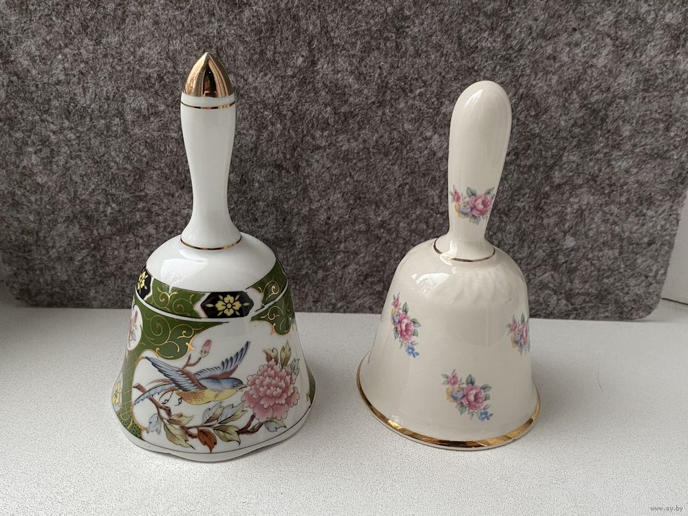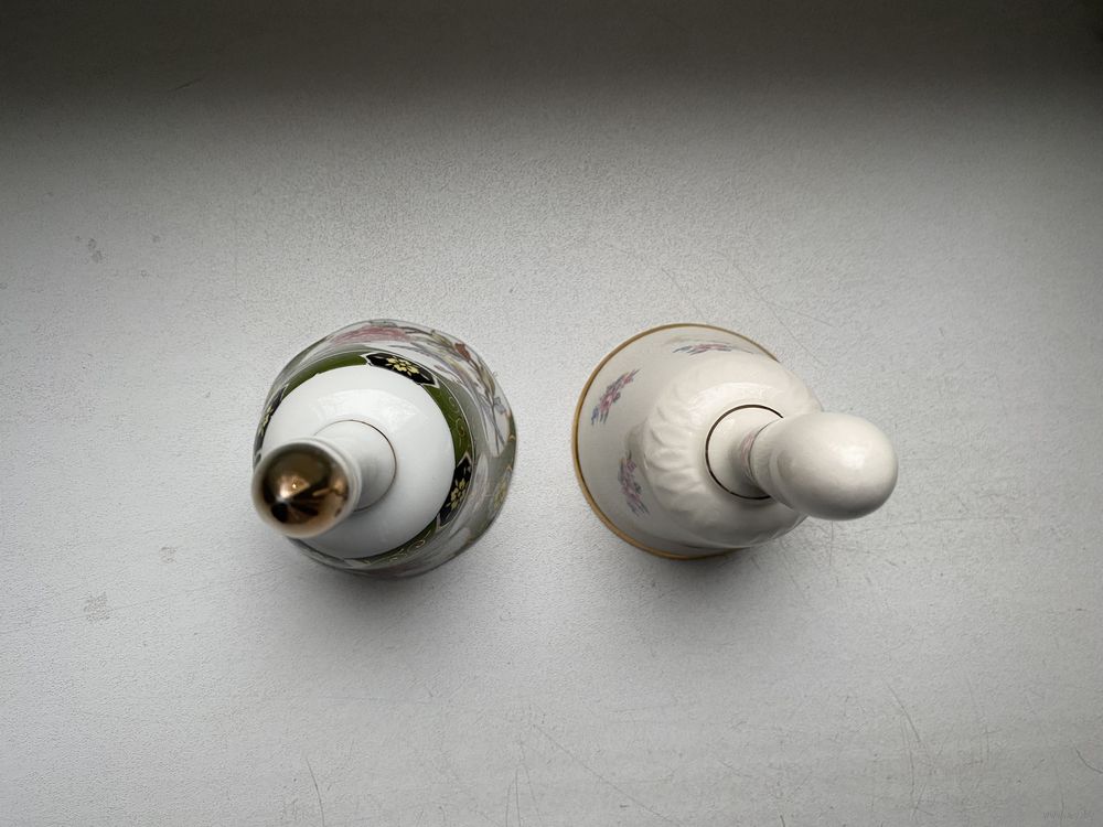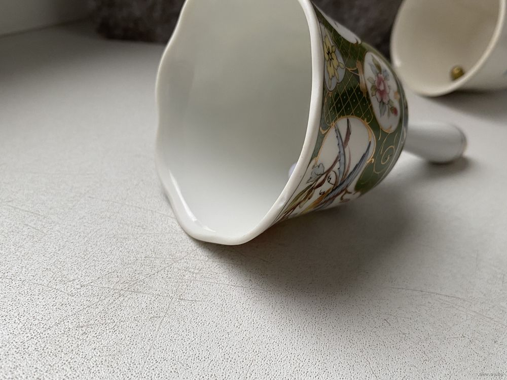 Левый (с птицами) - один мини скольчик по ободку, без трещин, см. по фото, высота - 13 см, покрытие сверху ручки - потертости (фарфор, Япония?)