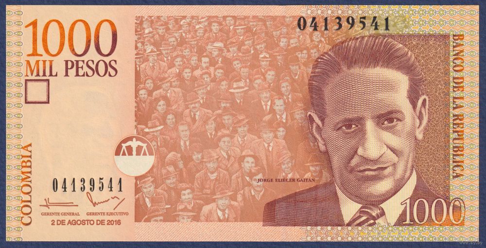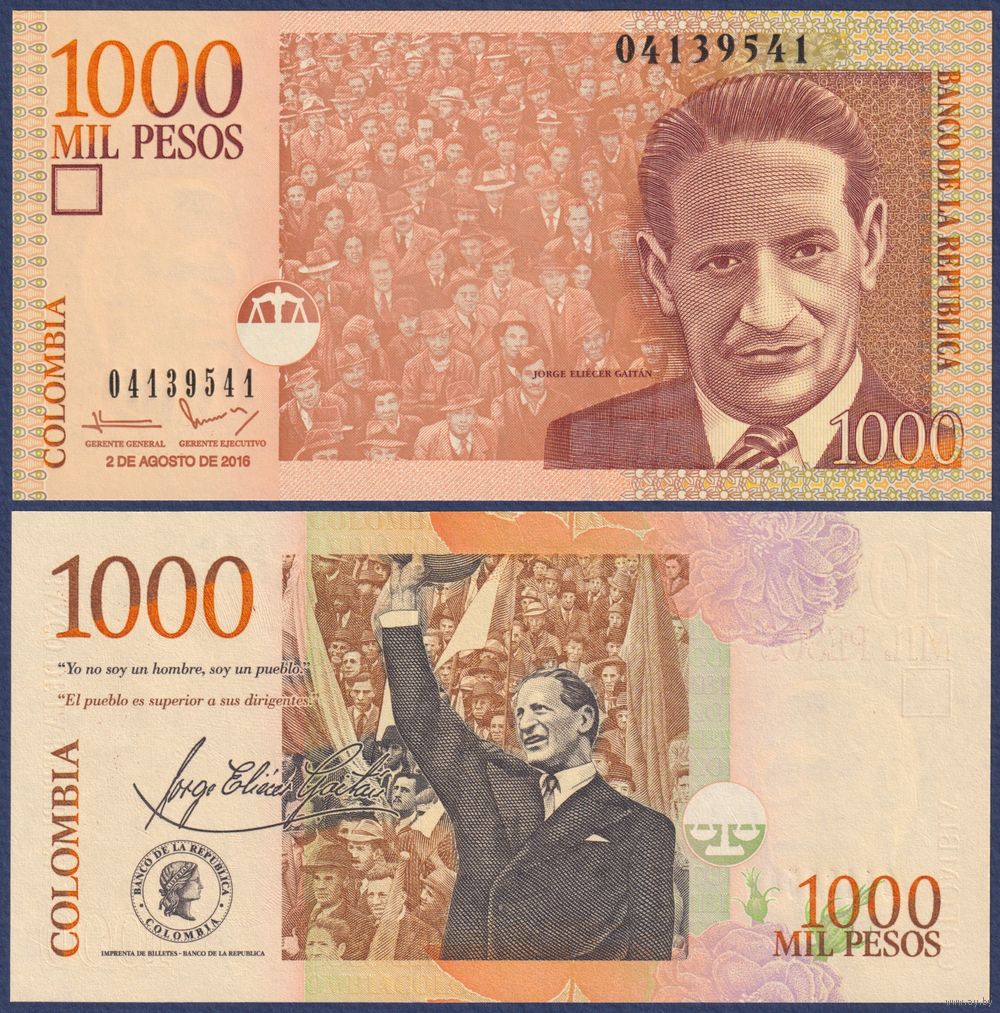 Колумбия, 1000 песо 2016 г, P-456 (политик Хорхе Эльесер Гайтан), UNC