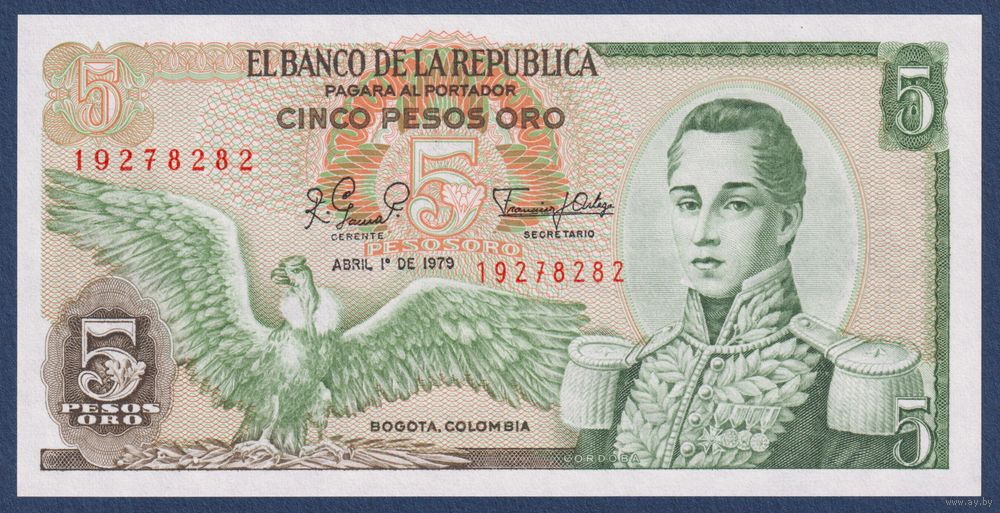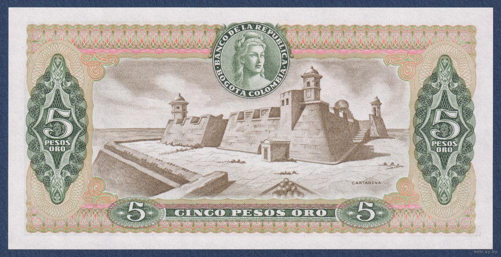 Колумбия, 5 песо 1979 г., P-406f (борец за независимость Хосе Мария Кордова, форт в Картахене), UNC