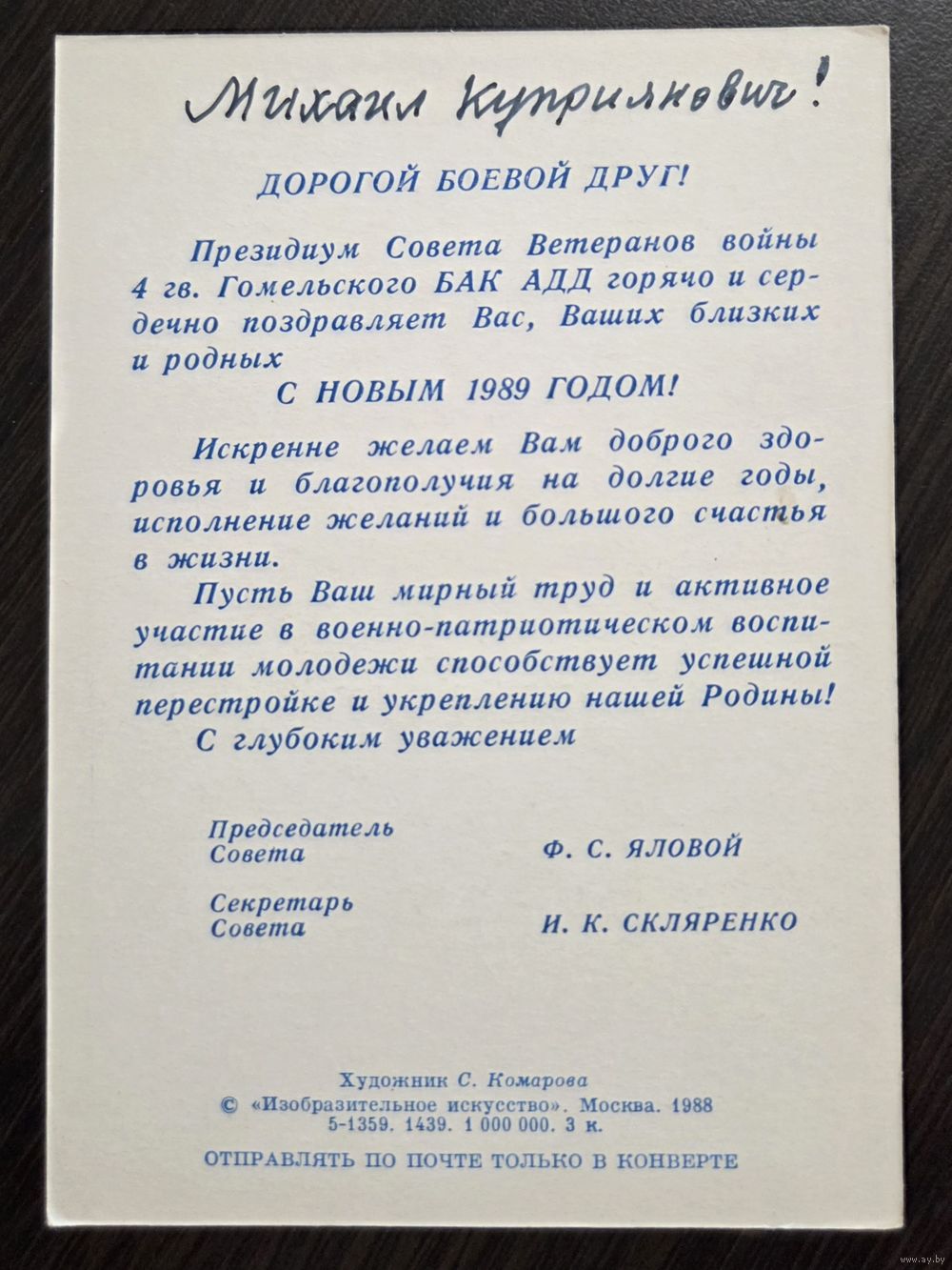 Комарова С Новым годом 1988 подписанная открытка СССР
