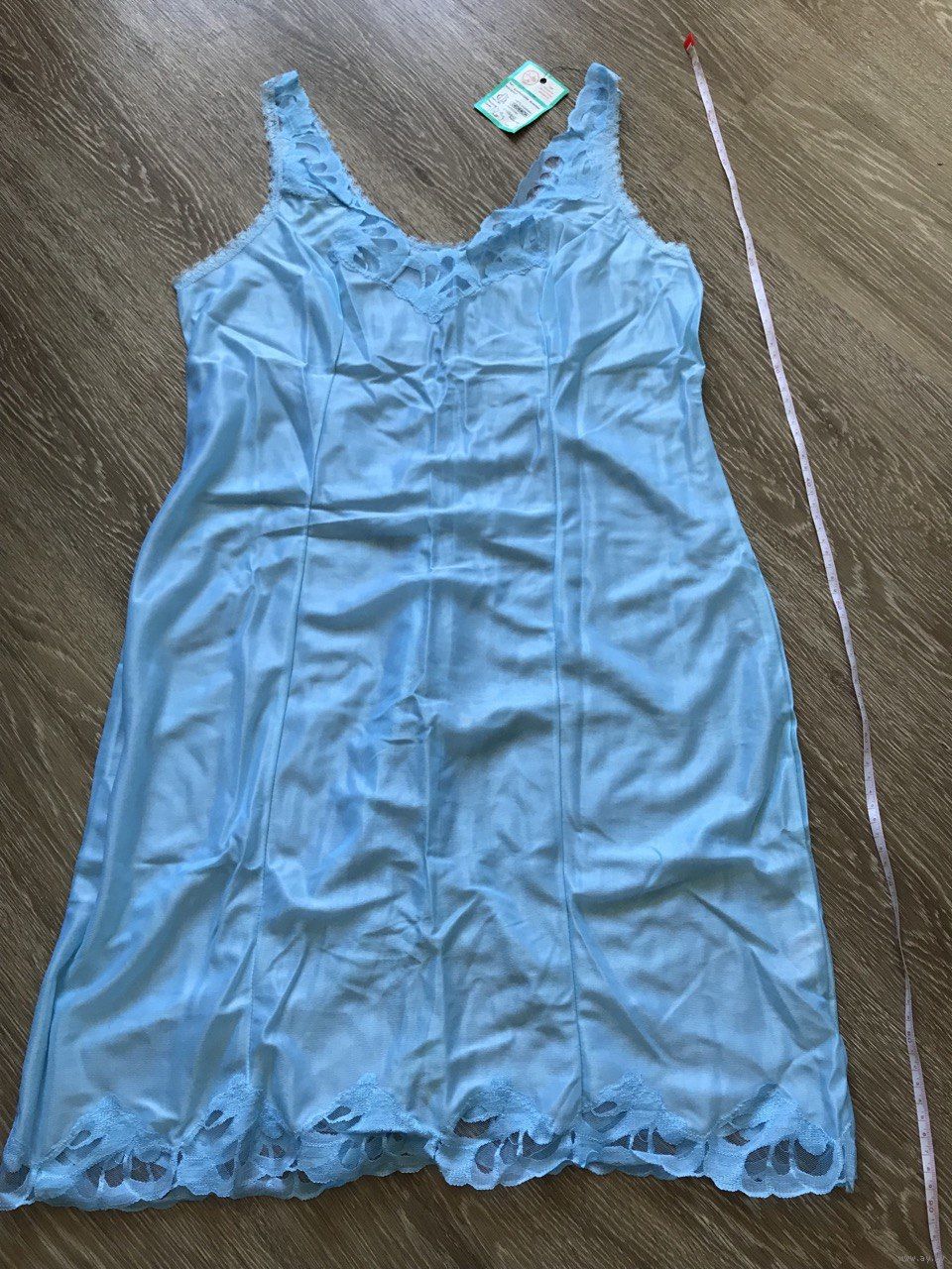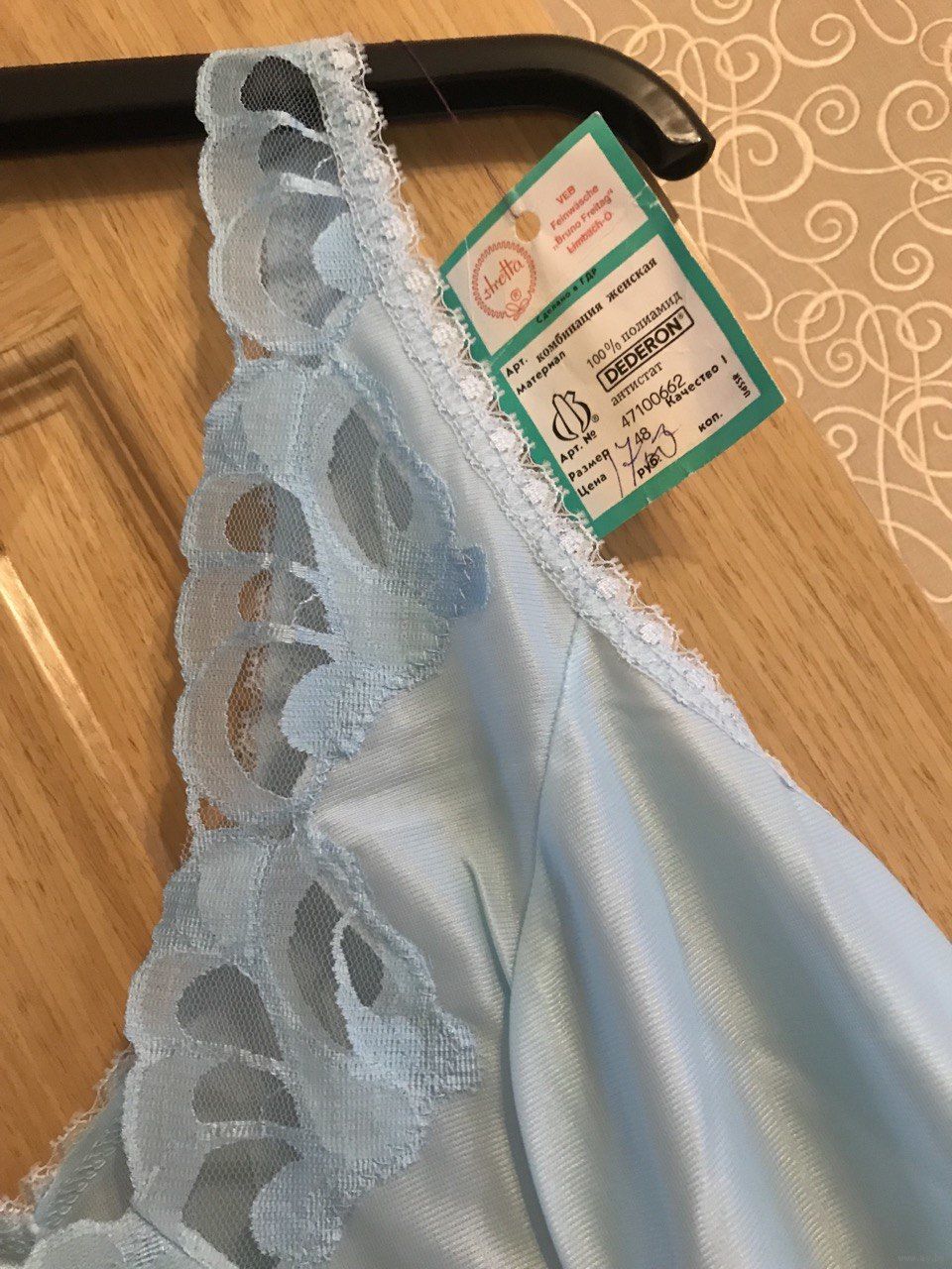 Настоящая находка для ценителей винтажного качества — роскошная комбинация производства ГДР. Редкий и очень нежный небесно-голубой цвет, который освежает и выглядит благородно. Кружево в тон на груди и по низу изделия.