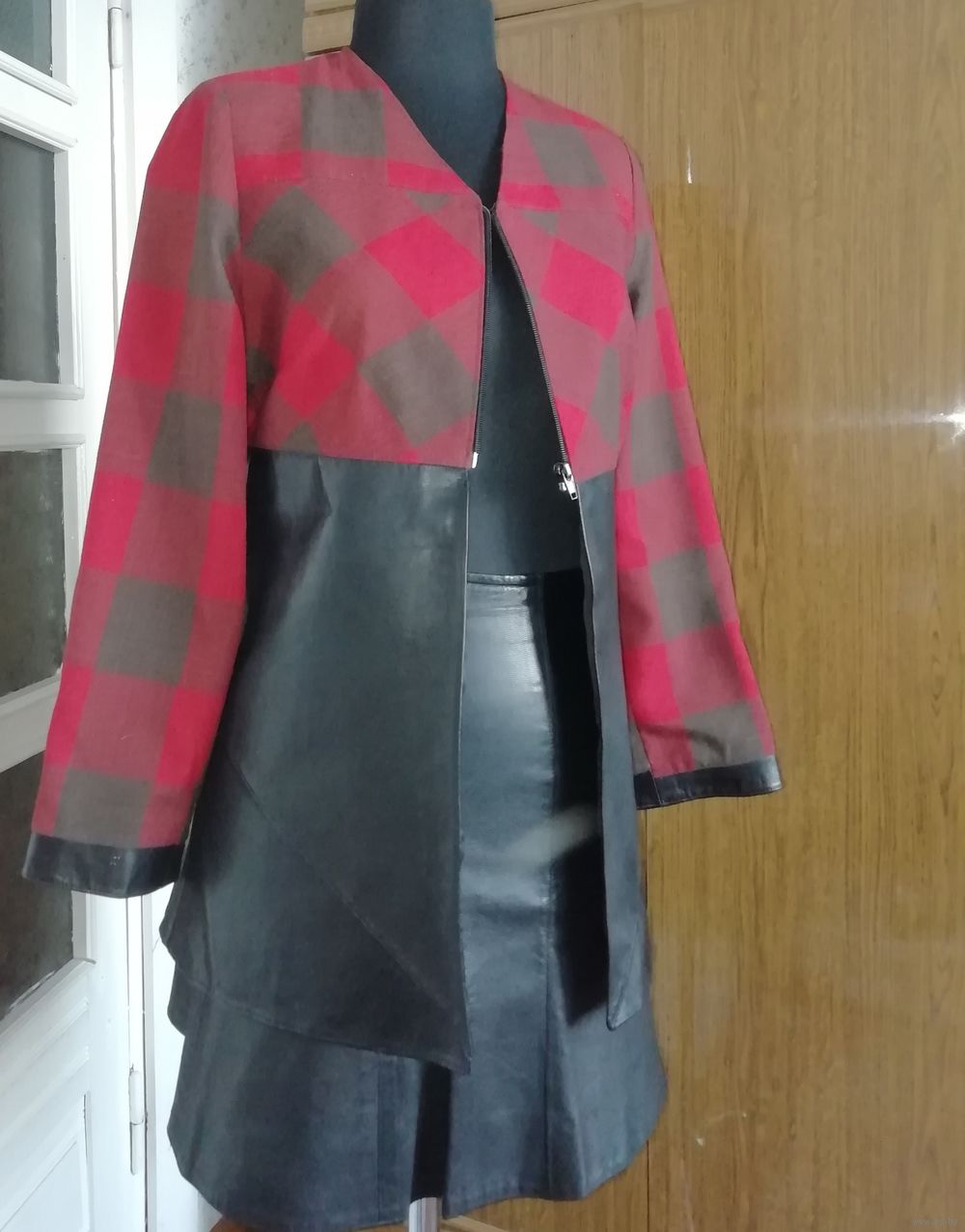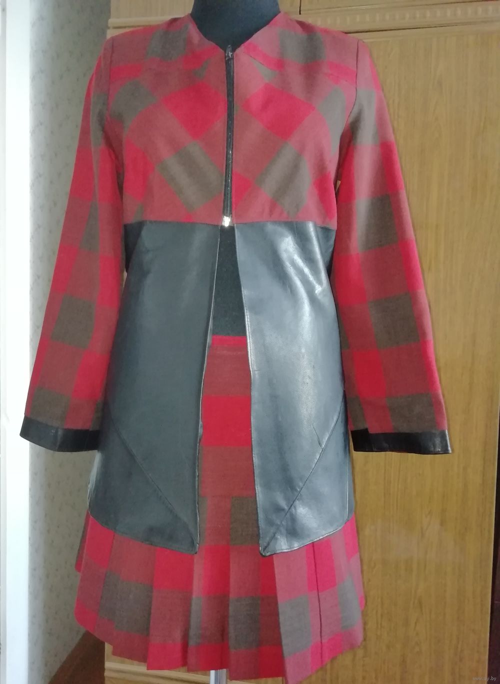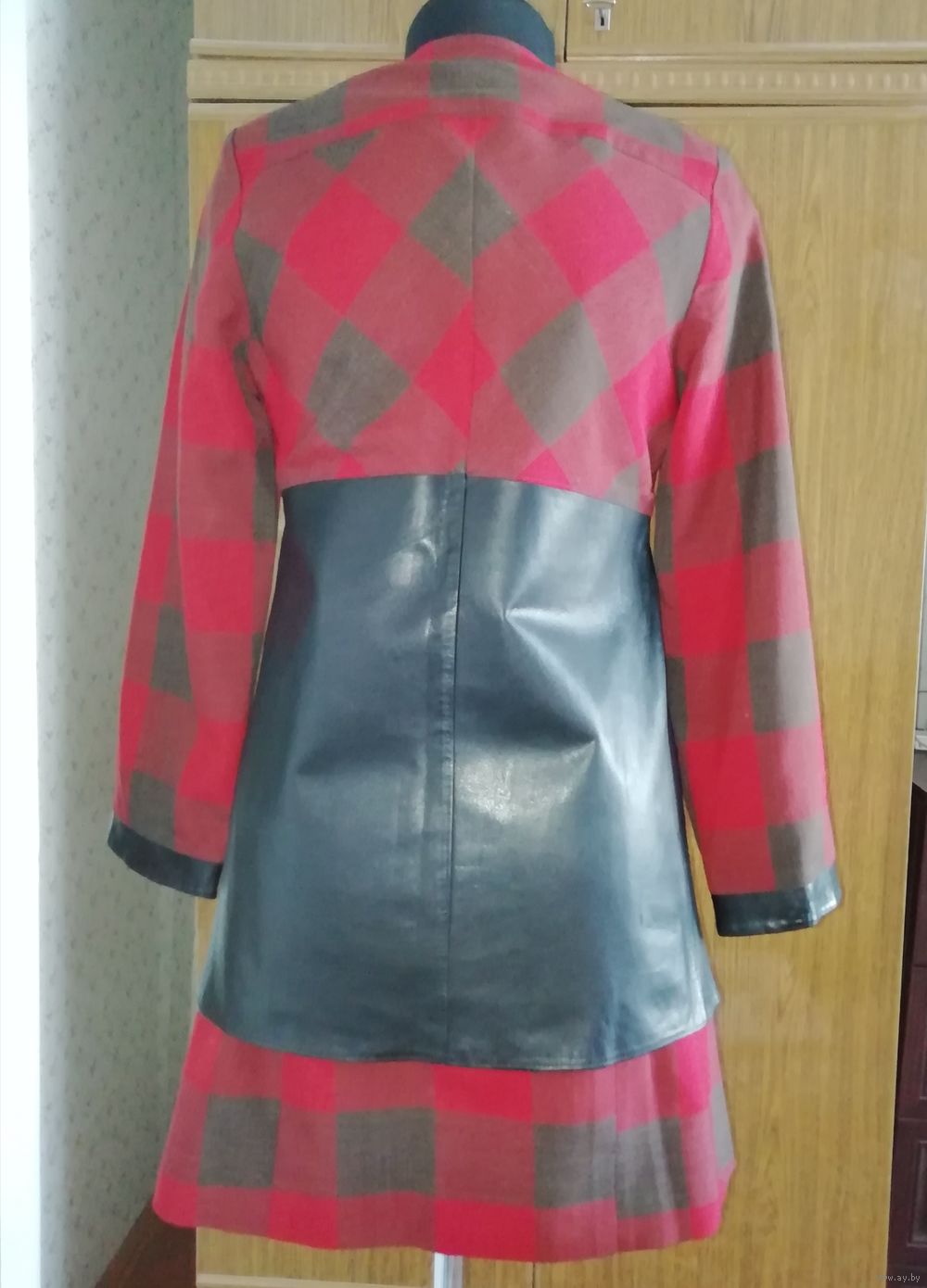 Кожа хорошо гладится утюгом на средней температуре через ткань, ткань шотланки не мнется. Костюмчик стоящий и неповторим. Жакет на спец плотной молнии до половины длинны.