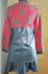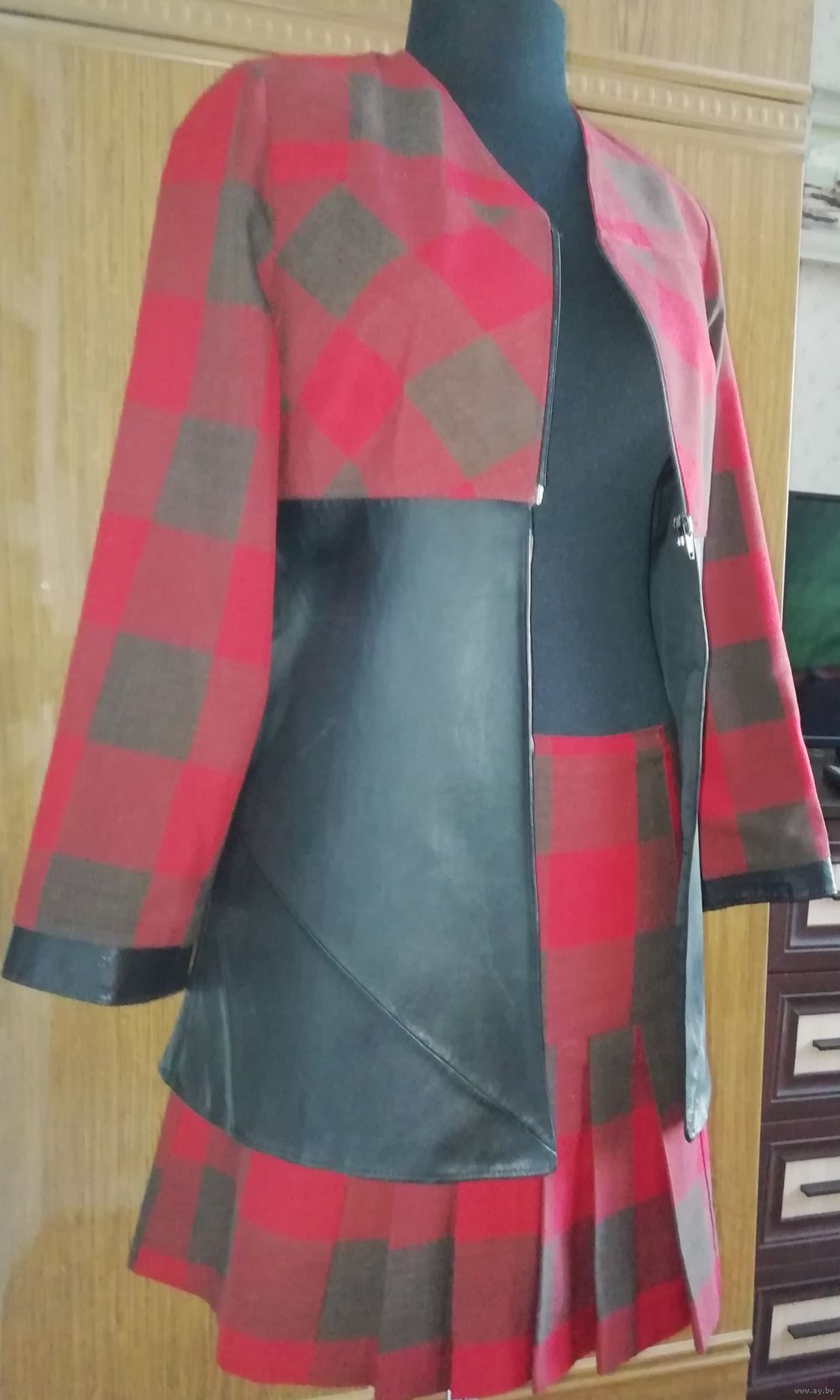 | Костюм индивидуального пошива, комбинирован необычно, смотрится красиво. Кожа наилучшей выделки-лайка. Юбка кожаная из клиньев, талия 77см,длинна45см,шотланка ниже талия 87см,жакет 79см длинна, рук59 | |