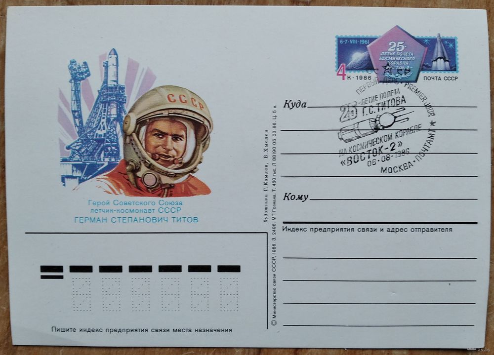 Комлев Г. Хмелев В. Герман Титов. Почтовая карточка (ПК с ОМ). 1988 г. Чистая. Спецгашение 25 лет полета на "Восток 2" (СГ).