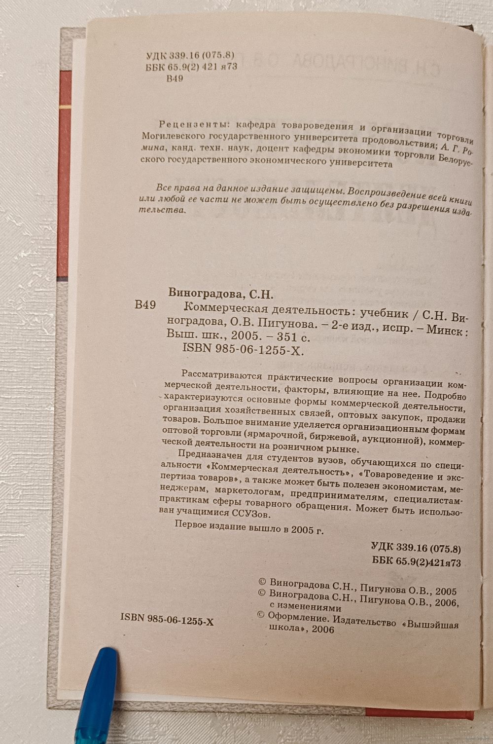 Коммерческая деятельность: учебник. С.Н. Виноградова, О.В. Пигунова. 2-е изд., испр. Минск: Выш. шк., 2005. - 351 с., твердый переплет, обычный формат.