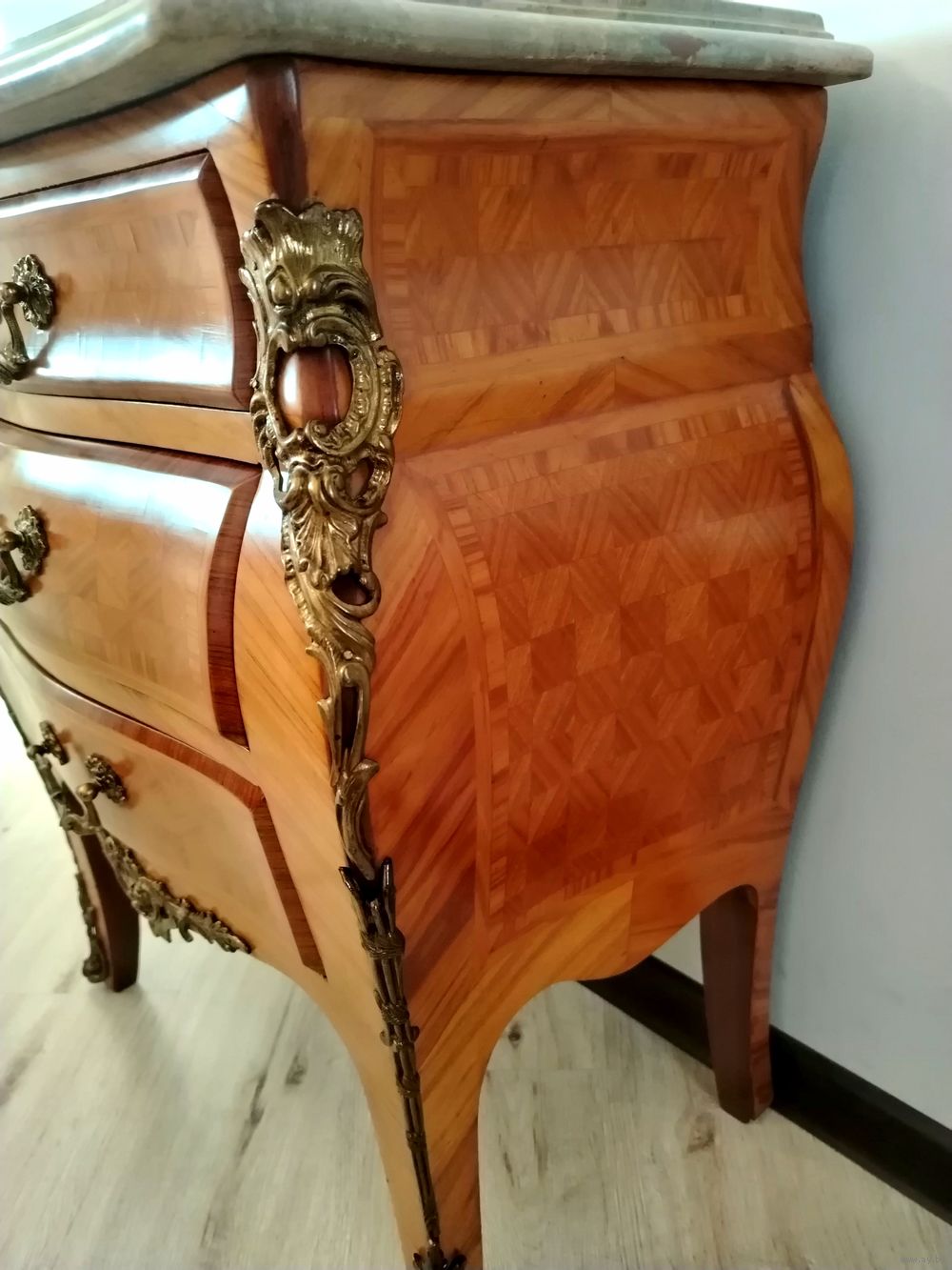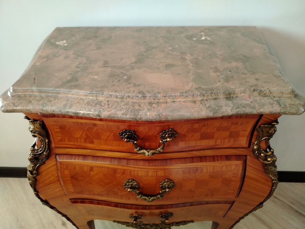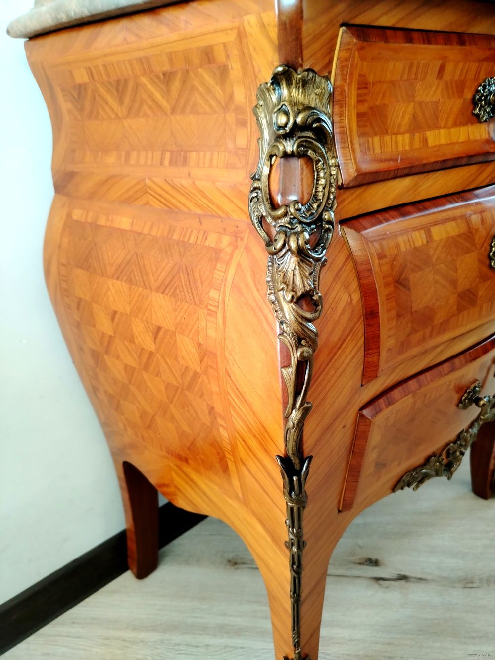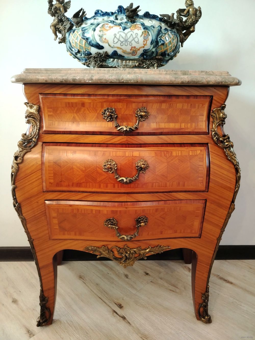 Небольшой комодик. Европа. Массив дерева, техника маркетри, бронзовые элементы. Высота 68см ширина 57см глубина 33см.