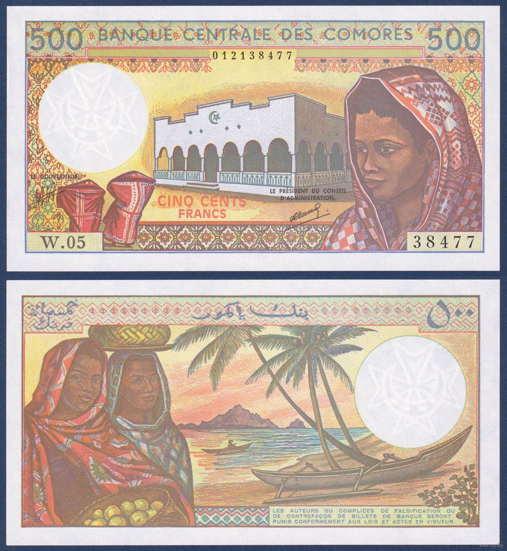 Коморские острова (Коморы), 500 франков 1984-2004 г., P-10b(2) (W, город Мутсамуду, женщины, лодки), UNC