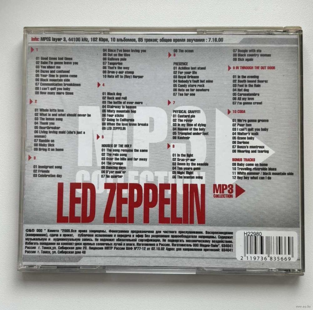 ДИСК ВКЛЮЧАЕТ В СЕБЯ 10 АЛЬБОМОВ И 85 ТРЕКОВ В ФОРМАТЕ МР3. ОБЩЕЕ ВРЕМЯ ЗВУЧАНИЯ БОЛЕЕ 7 ЧАСОВ. НА ОБЛОЖКЕ ЧЕРНО-БЕЛАЯ ФОТОГРАФИЯ УЧАСТНИКОВ ГРУППЫ : ДЖОН ПОЛ ДЖОНС, РОБЕРТ ПЛАНТ, ДЖИММИ ПЕЙДЖ И ДЖОН БОНЭМ. ДИСК ИЗ ЛИЧНОЙ КОЛЛЕКЦИИ. СВЯЗЬ : ТЕЛЕФОН, ВАЙБЕР!!!