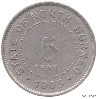 Компания Британского Северного Борнео (Протекторат Британское Северное Борнео). 5 центов 1903. Редкая. Корабль. Парусник.