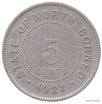 Компания Британского Северного Борнео (Протекторат Британское Северное Борнео). 5 центов 1921. Редкая (500000 шт.). Корабль. Парусник.