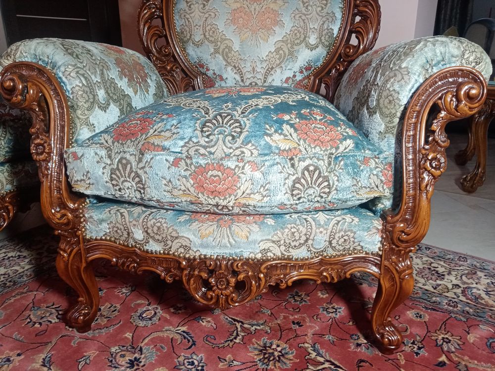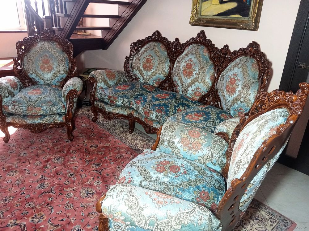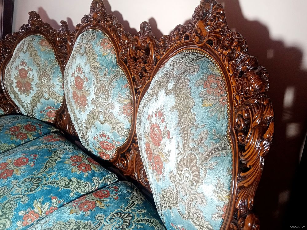 Комплект мебели диван тройка и два кресла. Италия. Дерево(орех) с красивой резьбой ручной работы, на пружинах, декоративные гвоздики, подушки перьевые. Диван высота по спинке 123 см ширина 215 см глубина всего дивана 80см глубина сиденья 62 см. Кресла высота по спинке 113 см ширина 98см глубина всего кресла 90 см глубина сиденья 65 см. Мебель в отличном состоянии без дефектов и повреждений.