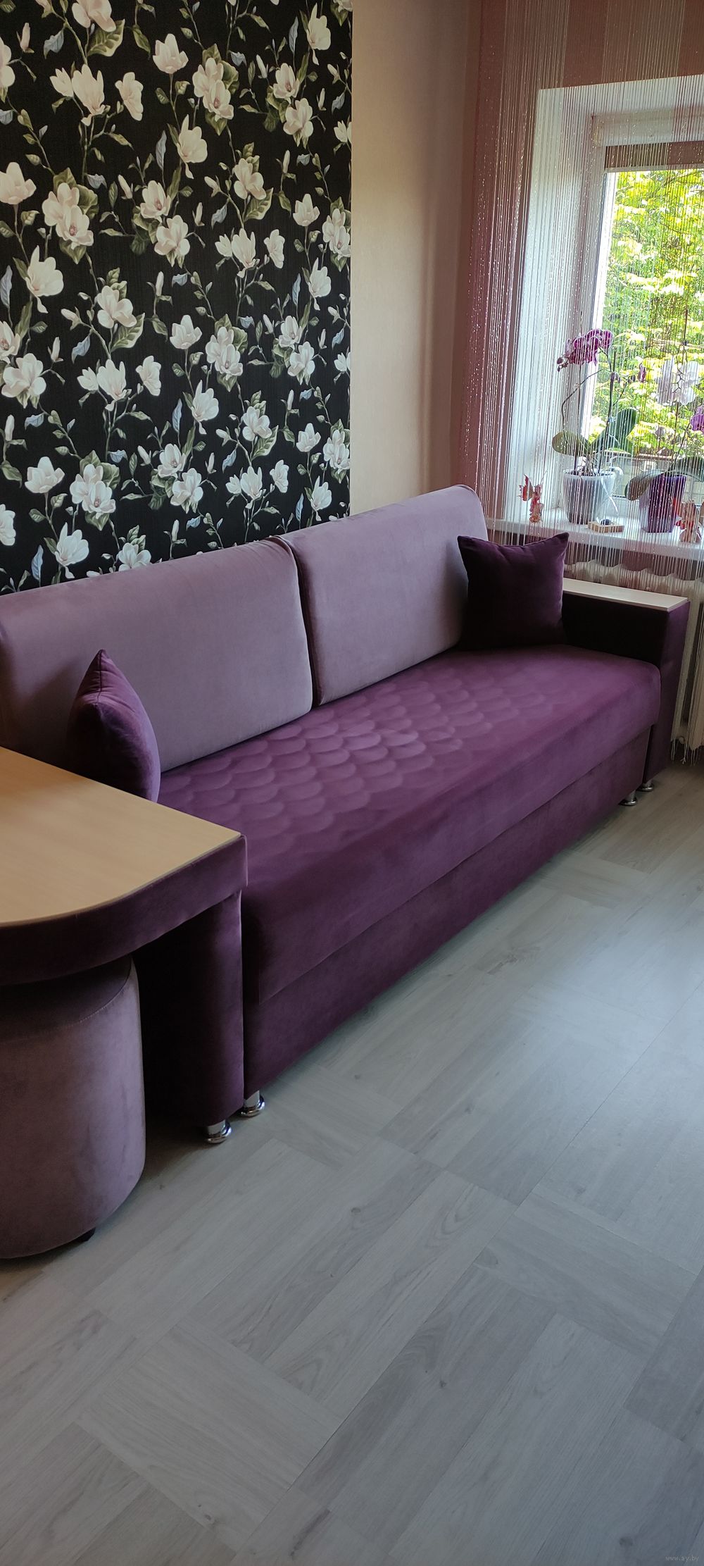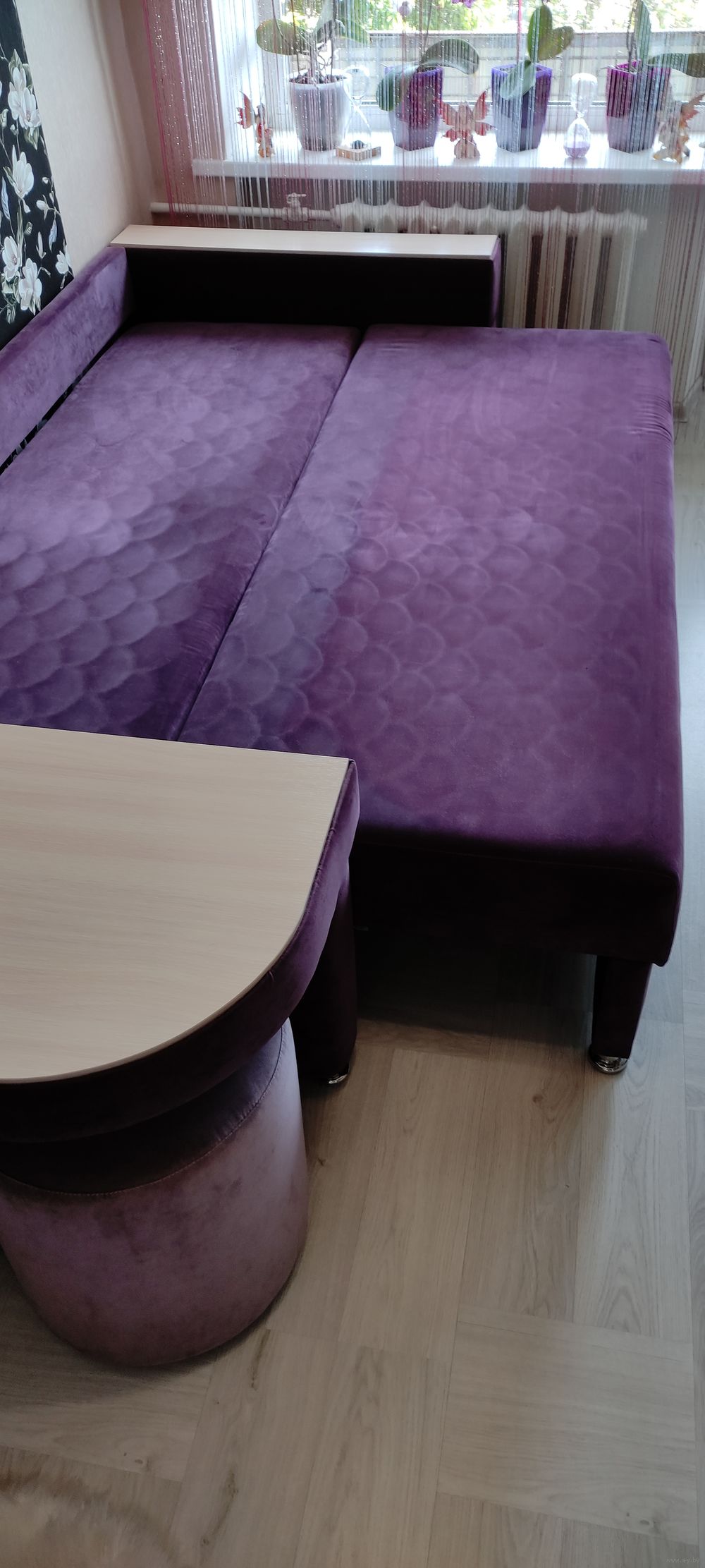 Мягкая мебель, комплект - диван со столиком и двумя пуфиками + кресло + подарок коврик (на фото у подножия кресла), состояние хорошее, полноценная двух спальная кровать с нишей для хранения. Размер в сложенном виде ( общий размер) 280×112см., в разложенном виде ( спальное место) 200×150см. Дополнительные размеры, что заинтересует, в л/с. Смотрите и другие мои лоты!