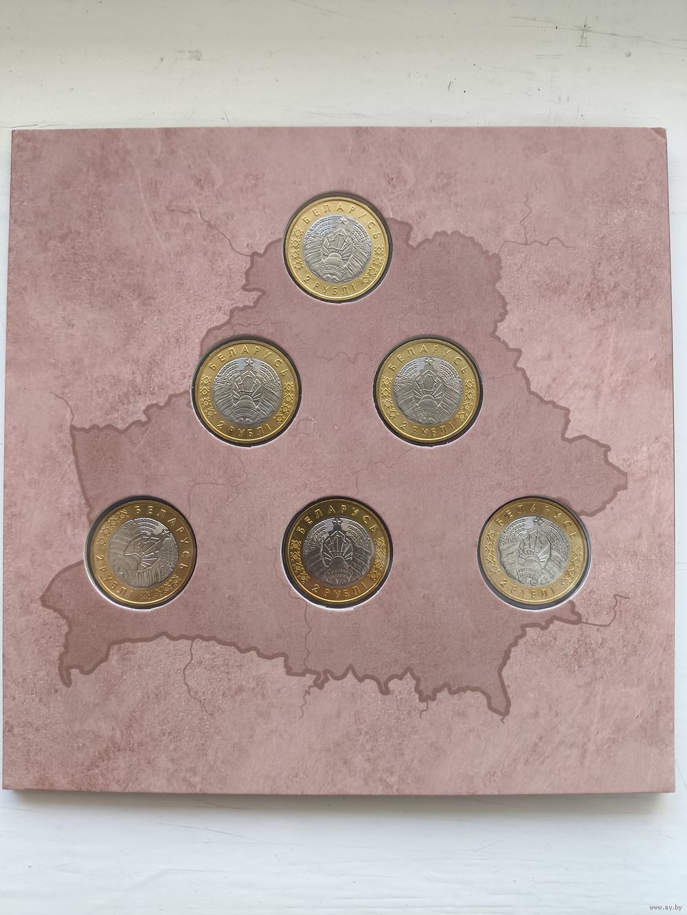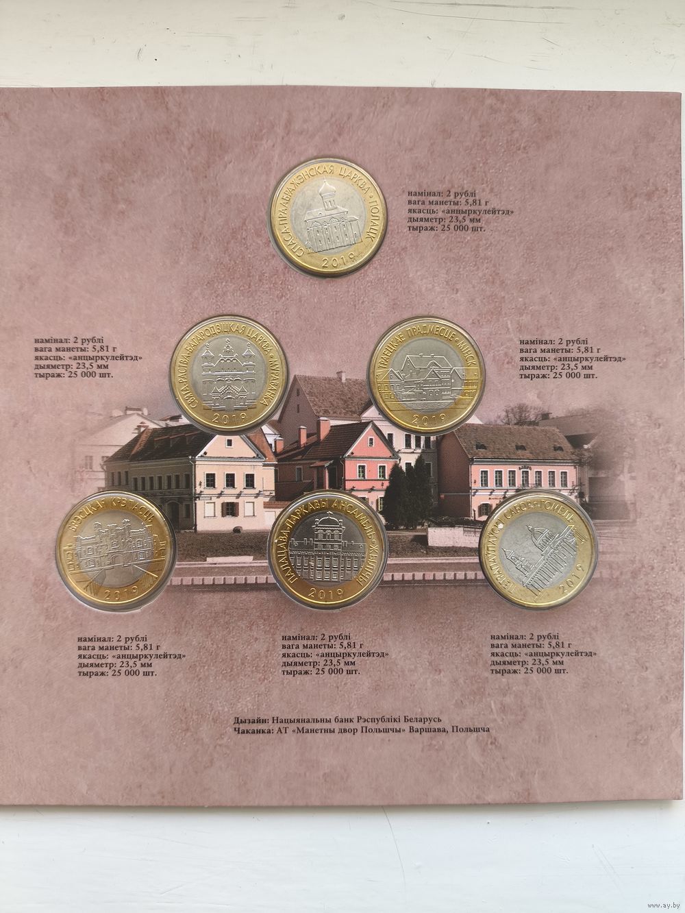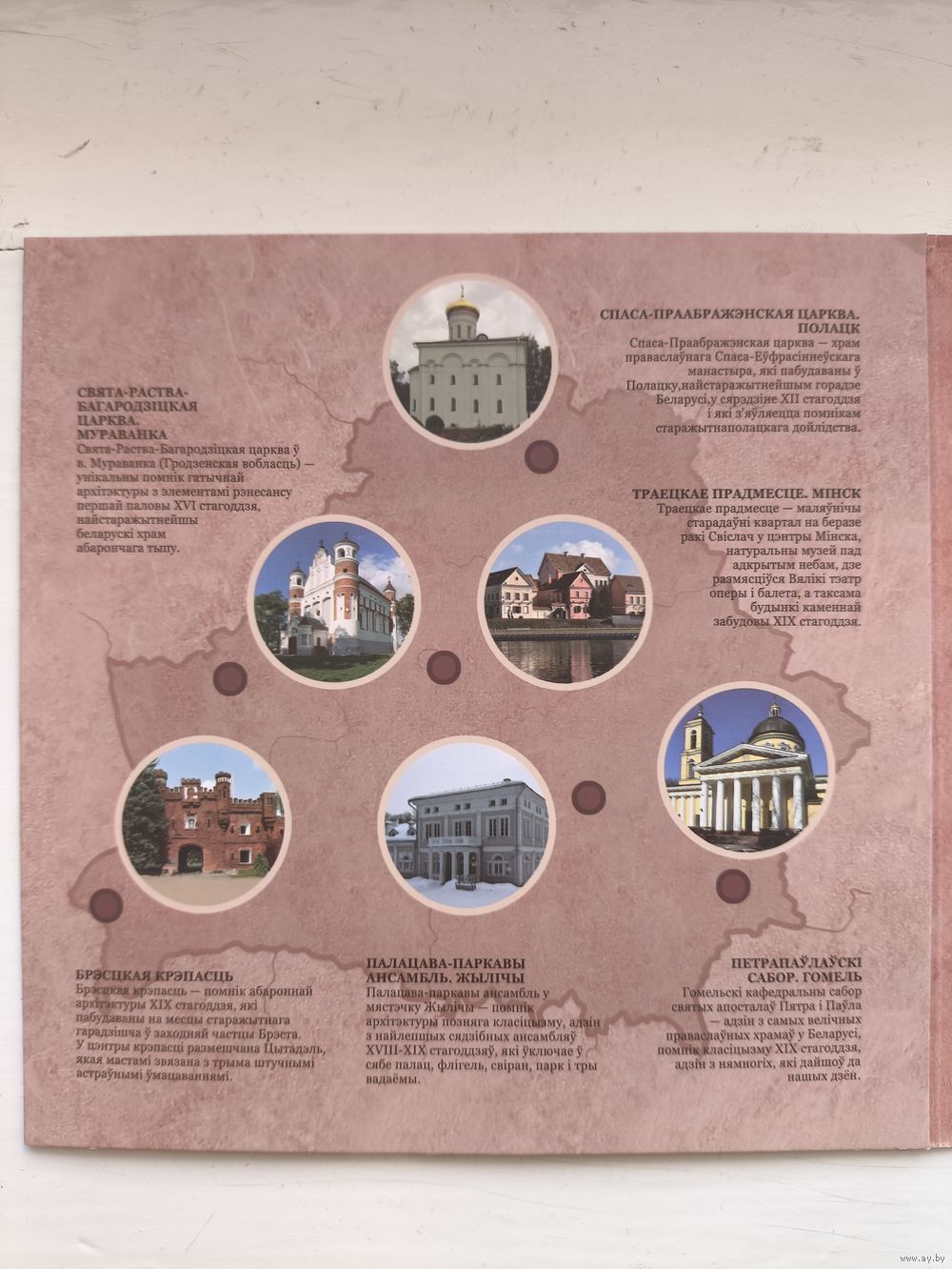 Комплект памятных монет серии "Архітэктурная спадчына Беларусі" в блистерной упаковке, состоящий из 6 монет по 2 рубля каждая, и включающий в себя по 1 монете каждого наименования в составе: памятная монета "Брэсцкая крэпасць", "Палацава-паркавы ансамбль. Жылічы", "Свята-Раства-Багародзіцкая царква. Мураванка", "Петрапаўлаўскі сабор. Гомель", "Спаса-Праабражэнская царква. Полацк", "Траецкае прадмесце. Мінск".