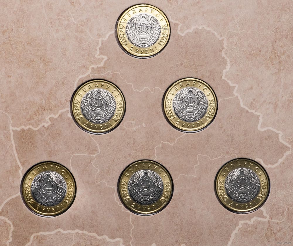 Комплект памятных монет серии "Архітэктурная спадчына Беларусі" в блистерной упаковке, состоящий из 6 монет, и включающий в себя по 1 монете каждого наименования в составе: "Чачэрская ратуша", "Касцёл бернардзінцаў. Будслаў", "Барысаглебская царква. Гродна", "Касцёл Яна Хрысціцеля. Камаі", "Косаўскі палац", "Будынак гарадскога тэатра. Магілёў"