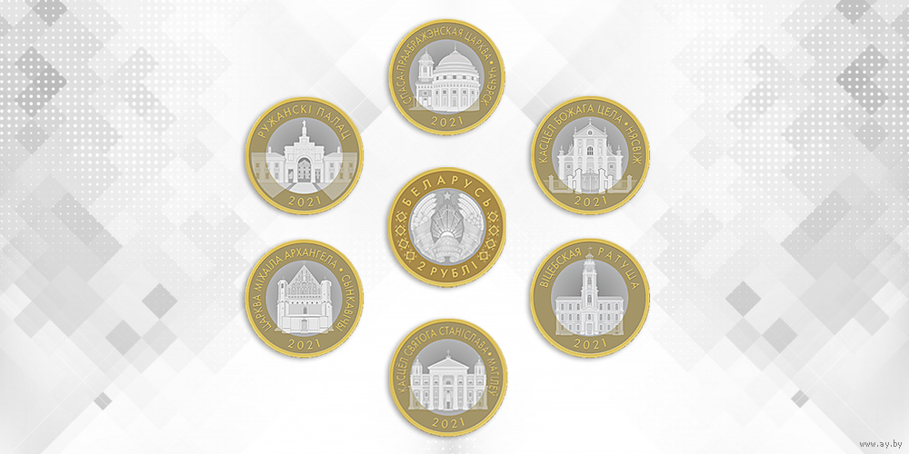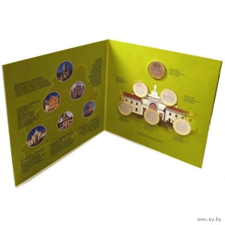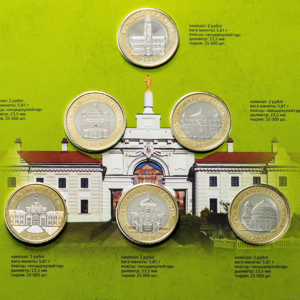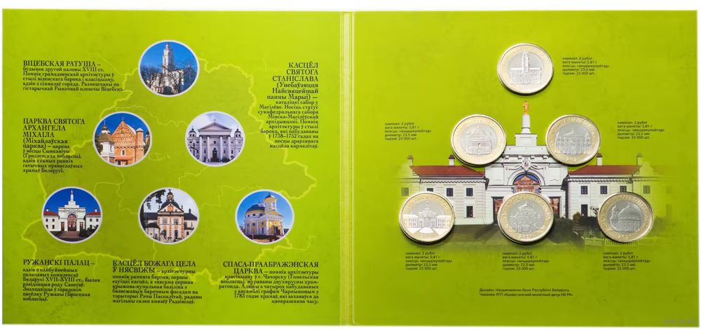 Комплект памятных монет серии "Архітэктурная спадчына Беларусі" в блистерной упаковке, состоящий из 6 монет, и включающий в себя по 1 монете каждого наименования в составе: "Ружанскі палац", "Касцёл Святога Станіслава. Магілёу", "Касцёл Божага цела. Нясвіж", "Царква Міхаіла Архангела. Сынкавічы", "Віцебская ратуша", "Спаса-Праабражэнская царква. Чачэрск"