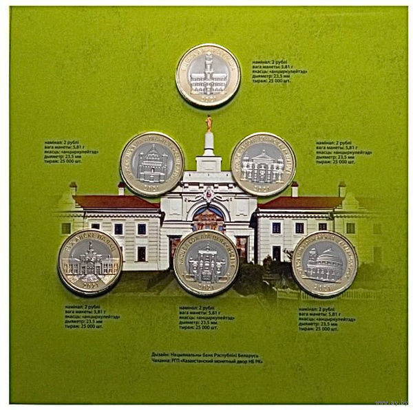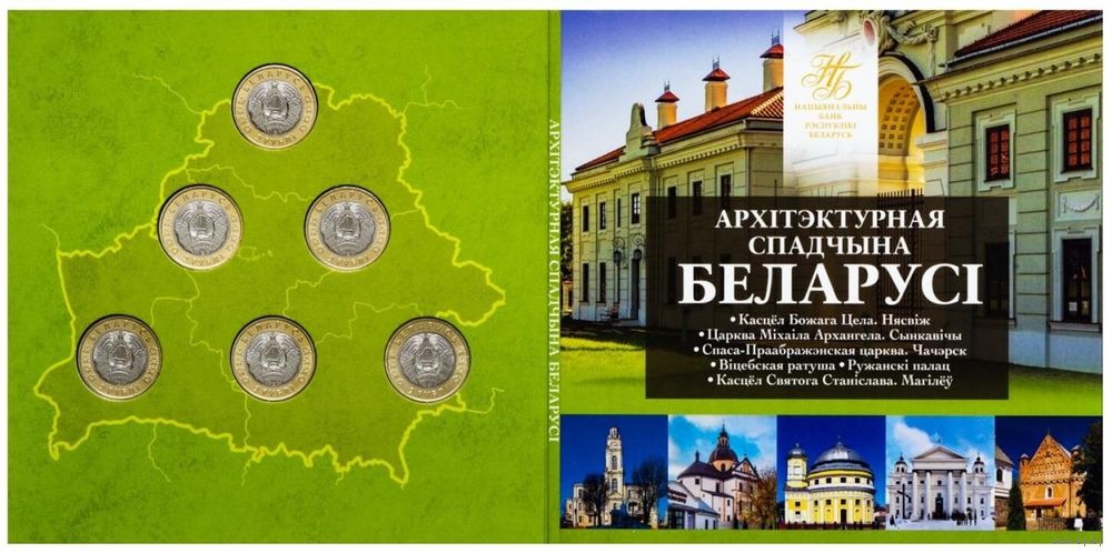 Комплект памятных монет серии "Архітэктурная спадчына Беларусі" в блистерной упаковке, состоящий из 6 монет, и включающий в себя по 1 монете каждого наименования в составе: "Ружанскі палац", "Касцёл Святога Станіслава. Магілёу", "Касцёл Божага цела. Нясвіж", "Царква Міхаіла Архангела. Сынкавічы", "Віцебская ратуша", "Спаса-Праабражэнская царква. Чачэрск"
