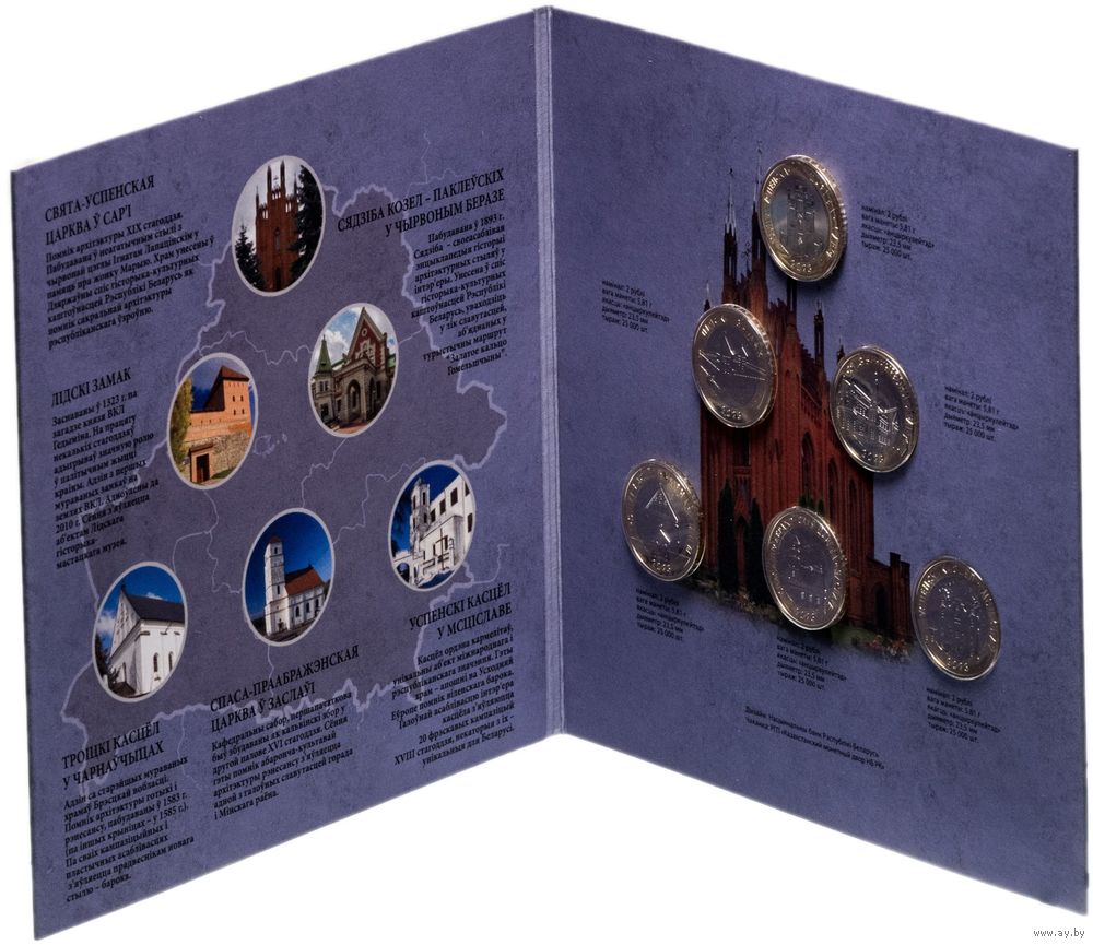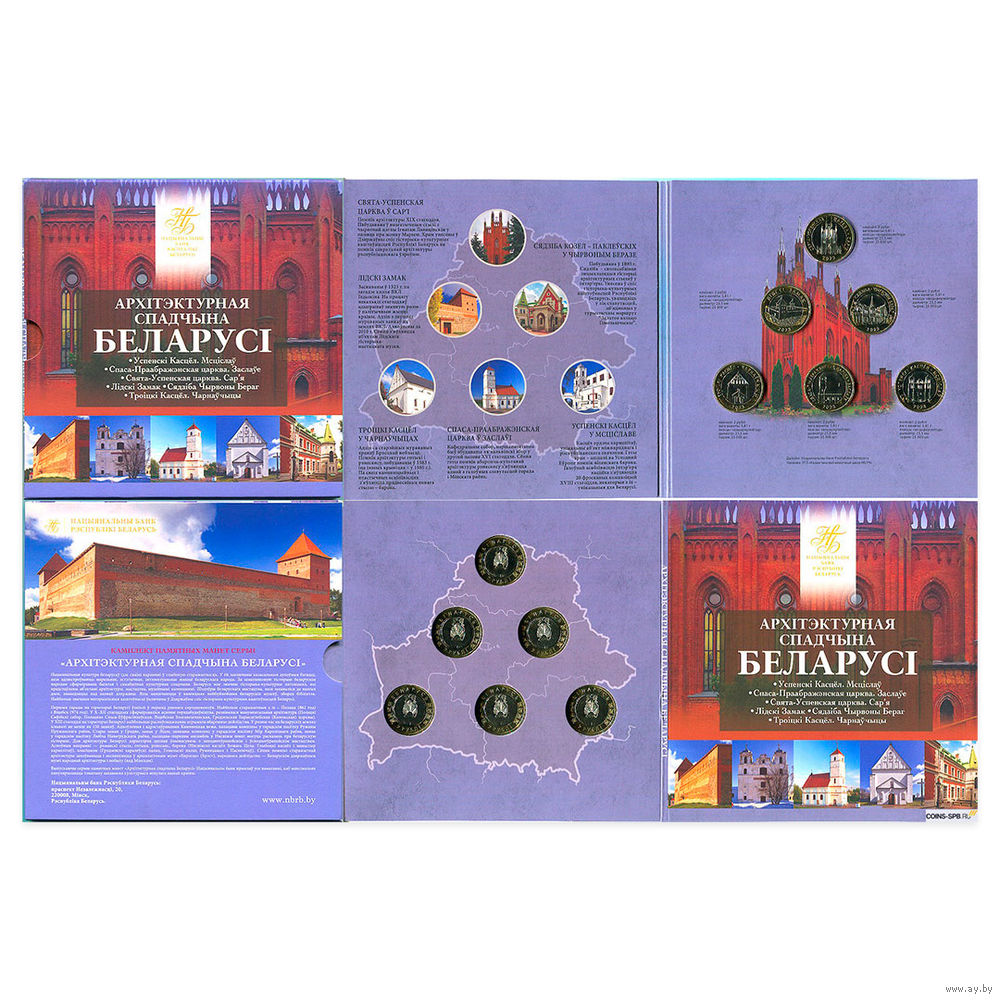 Комплект памятных монет серии "Архітэктурная спадчына Беларусі" в блистерной упаковке, состоящий из 6 монет, и включающий в себя по 1 монете каждого наименования в составе: "Чачэрская ратуша", "Касцёл бернардзінцаў. Будслаў", "Барысаглебская царква. Гродна", "Касцёл Яна Хрысціцеля. Камаі", "Косаўскі палац", "Будынак гарадскога тэатра. Магілёў"