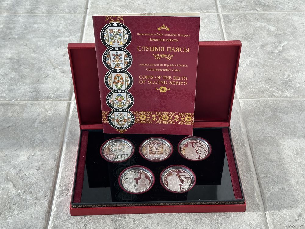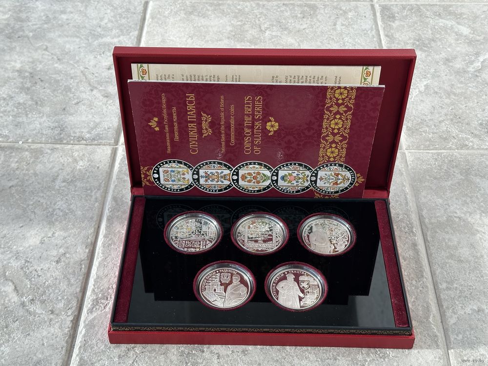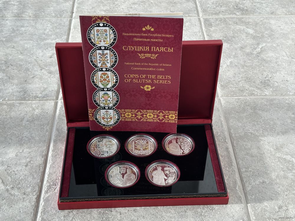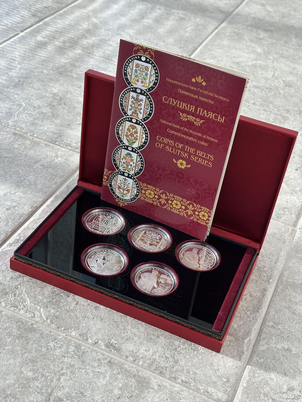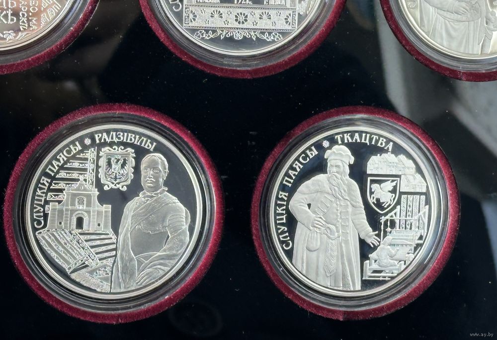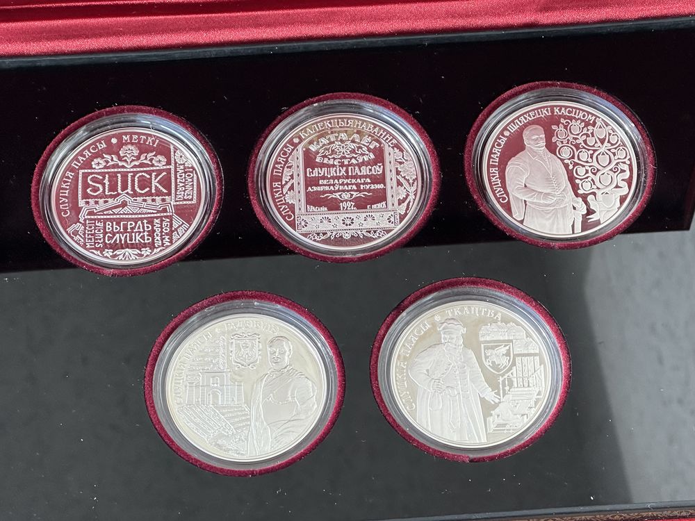 Комплект памятных монет в оригинальном футляре "Слуцкие пояса", 20 РУБЛЕЙ, СЕРЕБРО. "МЕТКИ". "КОЛЛЕКЦИОНИРОВАНИЕ". "КОСТЮМ ШЛЯХТИЧА". "РАДЗИВИЛЛЫ". "ТКАЧЕСТВО".