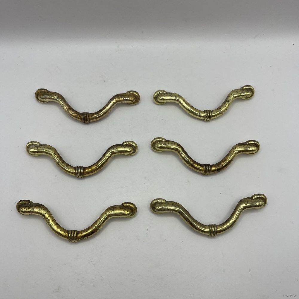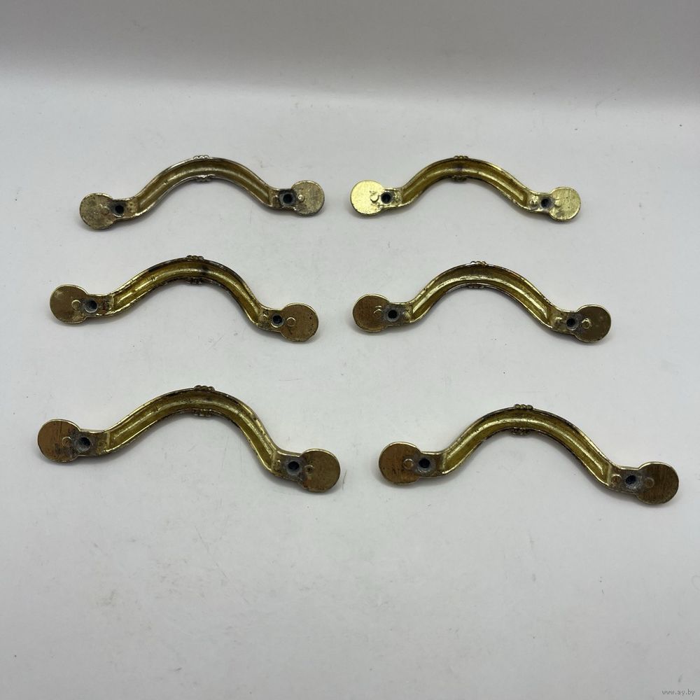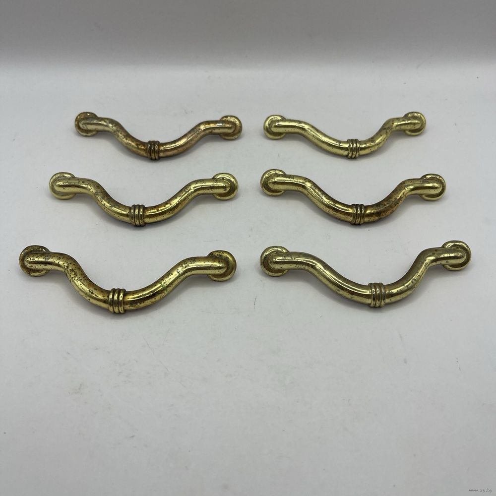 Комплект винтажных латунных ручек для мебели с рельефным лаконичным декором, 6 шт. Италия. 1950-е г.г. Размер 9 х 3 х 1 см. С внутренними отверстиями на резьбе. Естественная патина.