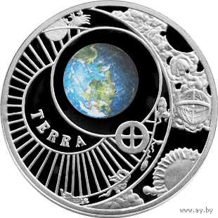в центре на фоне стилизованного изображения фрагмента солнечной системы, внутри которого по кругу на латинском языке надпись: SYSTEMA SOLARE, – античная скульптура Атланта, держащего на плечах планету Земля; вверху – рельефное изображение Государственного герба Республики Беларусь; вверху по кругу надпись: РЭСПУБЛІКА БЕЛАРУСЬ, слева по кругу – номинал 10 РУБЛЁЎ; справа по кругу – год чеканки, проба сплава, фирменный (товарный) знак АО "Монетный двор Польши".