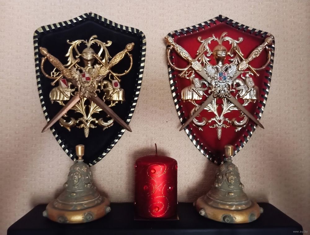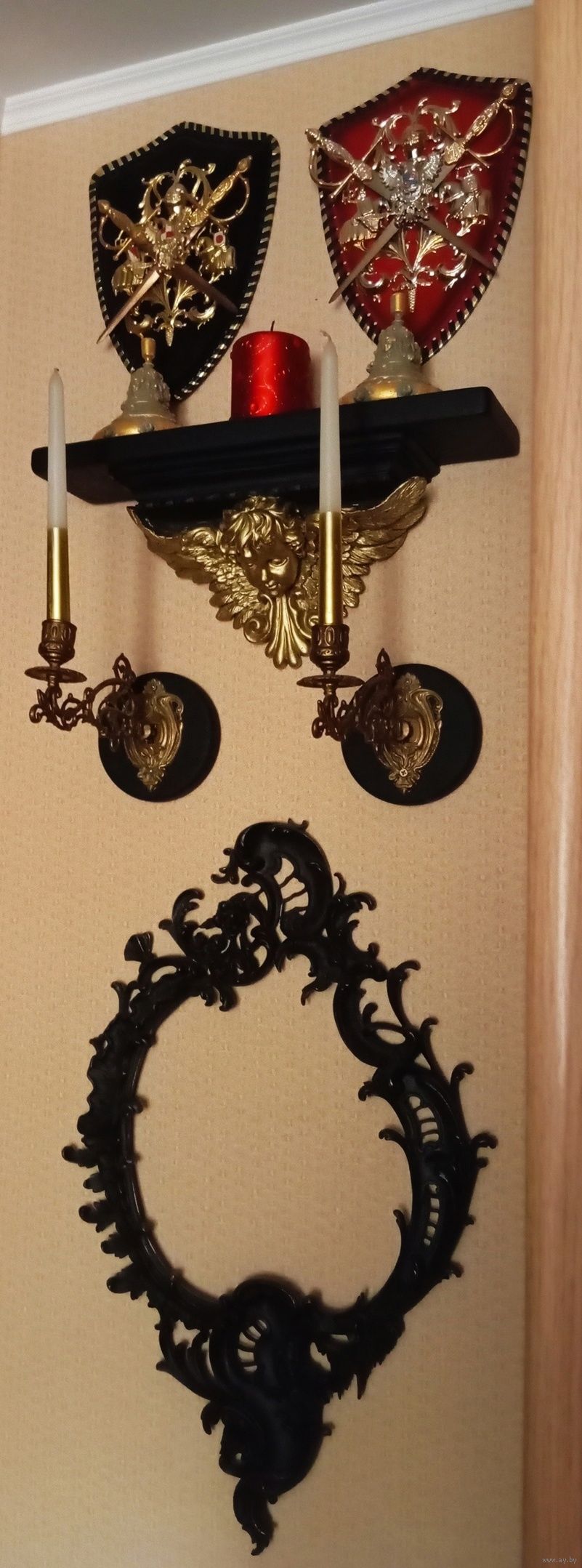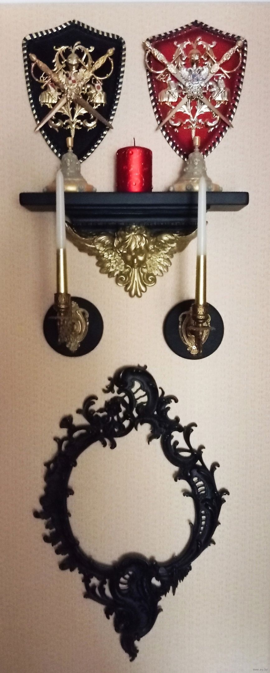 Композиция АНГЕЛ-ХРАНИТЕЛЬ - гипс , позолота , эмаль матовая . Общий размер композиции 140х46 см . Два герба Испания , бархатный картон , метал, пластик . Консоль-Ангел , гипс , перламутр , акрил . Три свечи . Колокольчики 2 шт. , копии с колокольчика 19 века , гипс , перламутр , акрил . Два подсвечника от рояля , бронза , 19 век . Две площадки под подсвечники , гипс , эмаль матовая . Рама барокко , под зеркало и пр. , Франция , чугун , 67х44 см. , 19 век .Всё Белпочтой или самовывоз