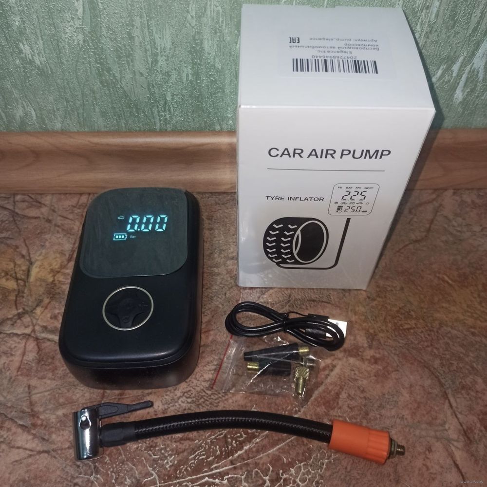 Компрессор аккумуляторный,в комплекте есть насадки и переходники + кабель для зарядки ,можно использовать как повербанк и фонарь.