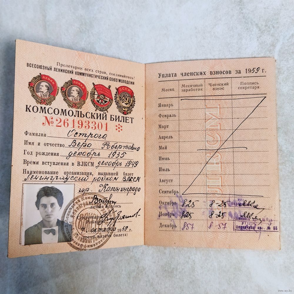 Комсомольский билет. Бланк РСФСР. Четыре ордена. ВЛКСМ. СССР. 1959 год.