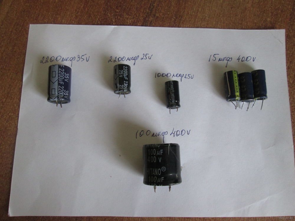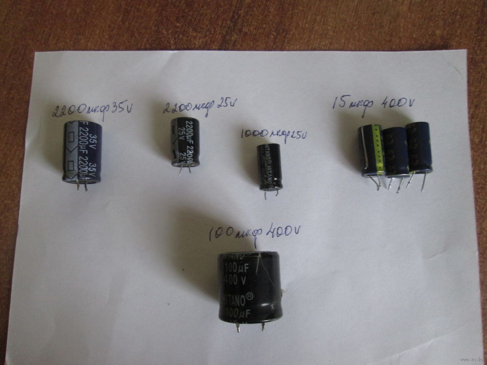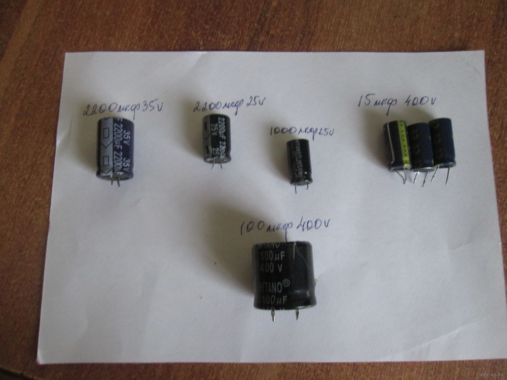 | Есть 7 шт.15мкф400в-3 шт,2200мкф35в-1шт,2200мкф25в-1шт,1000мкф25в-1шт,100мкф400в-1шт. | |