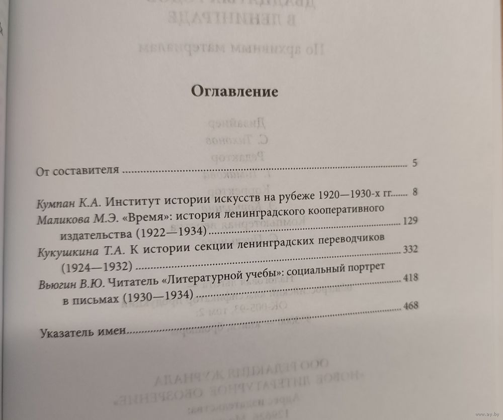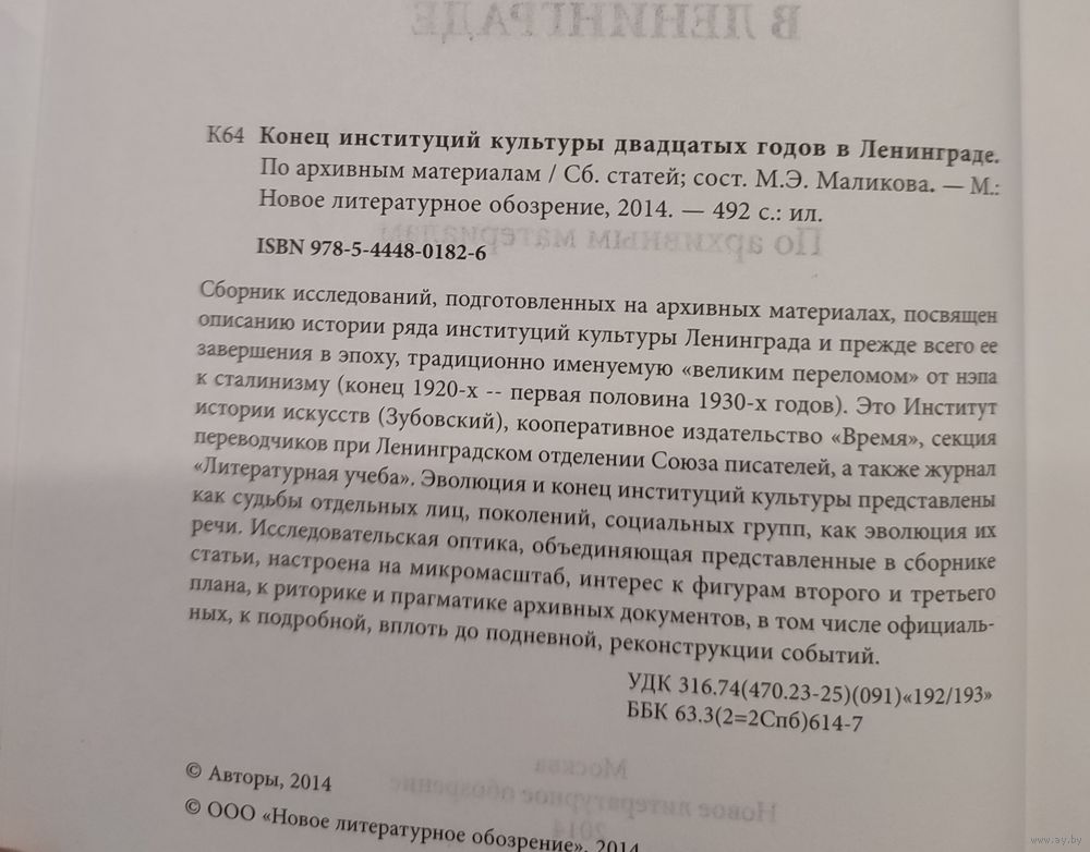 Сборник исследований, подготовленных на архивных материалах, посвящен описанию истории ряда институций культуры Ленинграда и прежде всего ее завершения в эпоху, традиционно именуемую «великим переломом» от нэпа к сталинизму (конец 1920-х — первая половина 1930-х годов). Это Институт истории искусств (Зубовский), кооперативное издательство «Время», секция переводчиков при Ленинградском отделении Союза писателей, а также журнал «Литературная учеба». Эволюция и конец институций культуры представлены как судьбы отдельных лиц, поколений, социальных групп, как эволюция их речи. Исследовательская оптика, объединяющая представленные в сборнике статьи, настроена на микромасштаб, интерес к фигурам второго и третьего плана, к риторике и прагматике архивных документов, в том числе официальных, к подробной, вплоть до подневной, реконструкции событий.