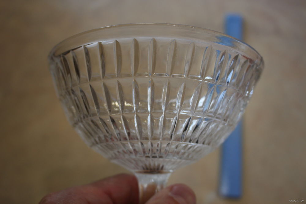 Стекло (светлое). Высота 14 см, диаметр верх 13,4 см, диаметр низ 7,8 см. Клейма нет.