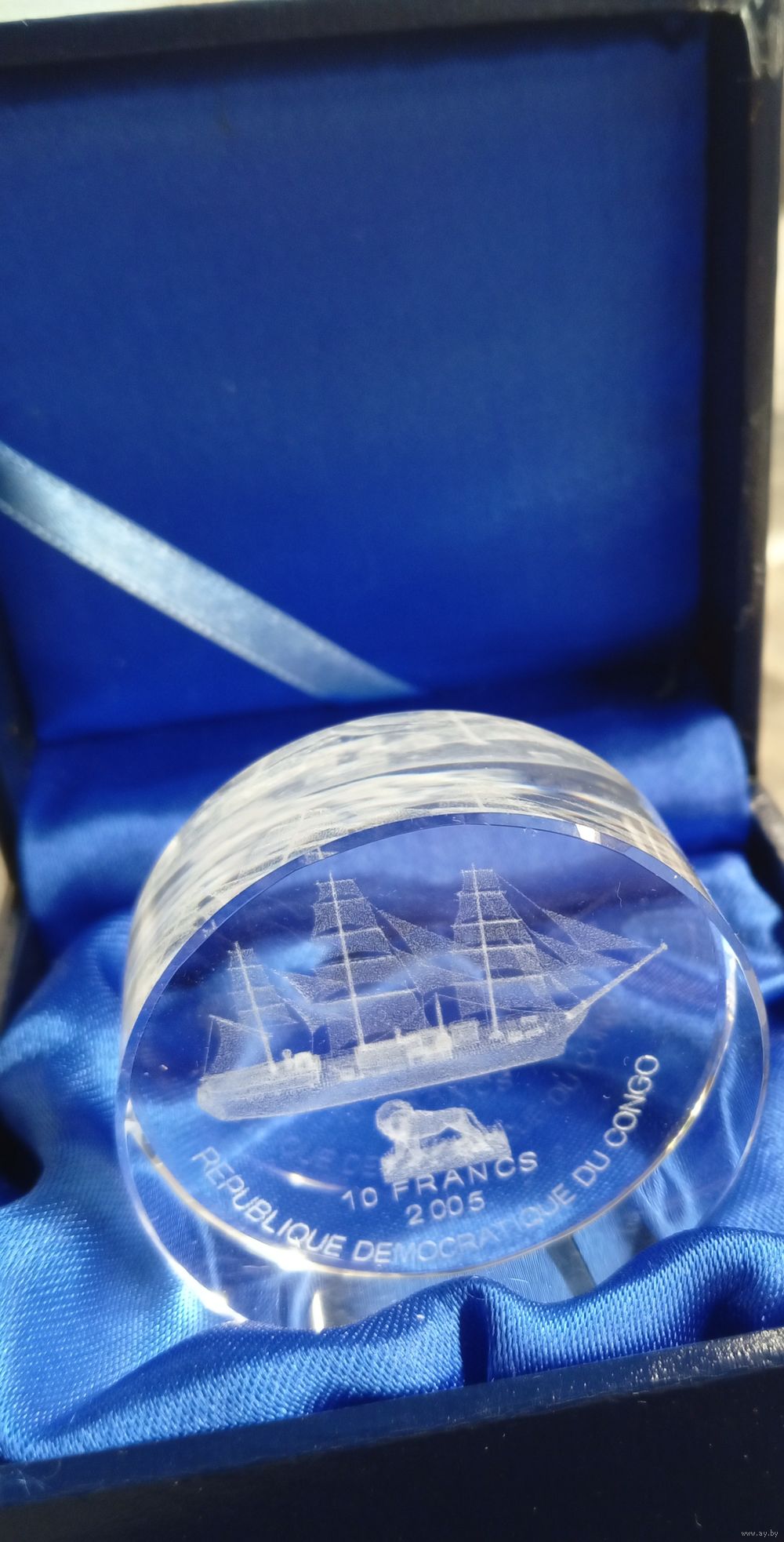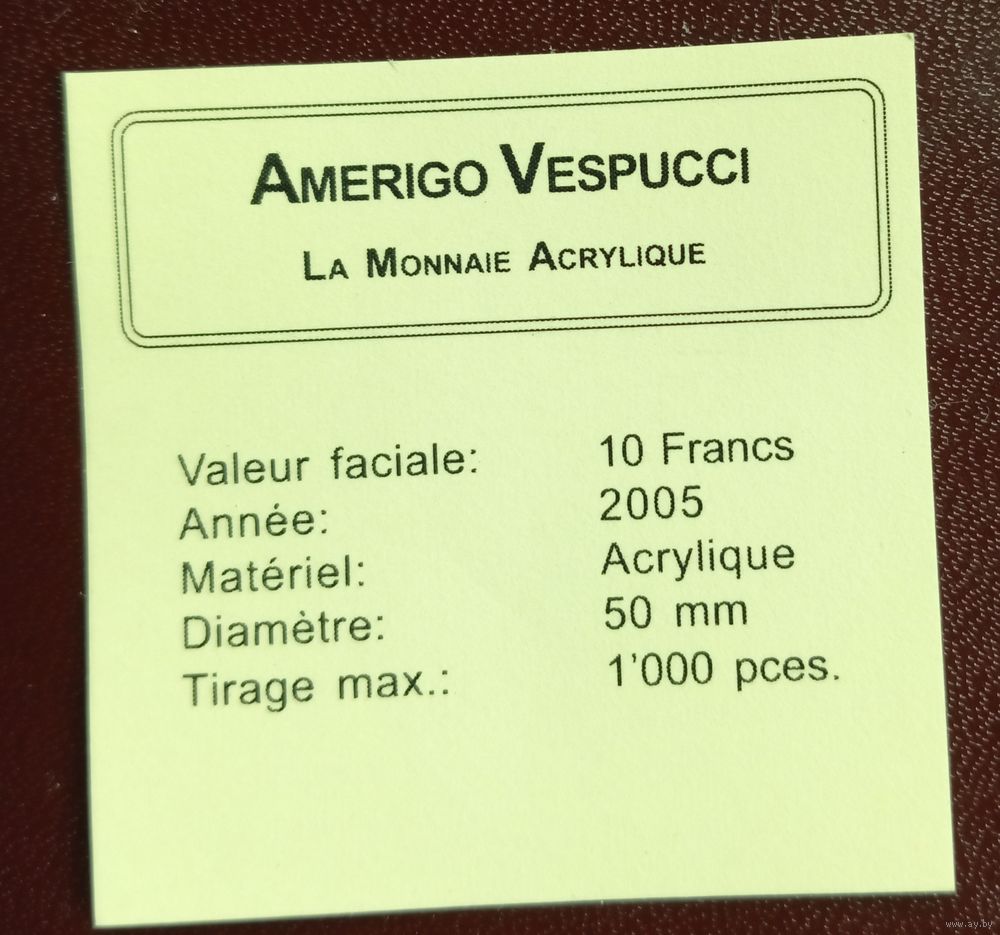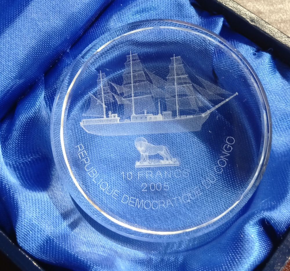 Большая красивая прозрачная монета из акрила, с изображением корабля Америго Веспуччи.