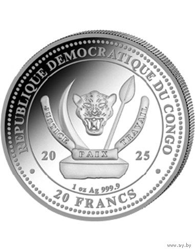 Имея статус законного платежного средства в Демократической Республике Конго и номинал 20 франков, Рифленый гурт, диаметр 38,6 мм и вес в одну тройскую унцию – типичные черты классической инвестиционной монеты. Монета Премиум-класса, Пруф лайк.