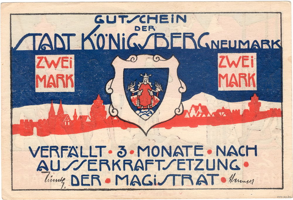 Konigsberg in der Neumark (прусская провинция Brandenburg, ныне Хойна, Польша), 2 марки, 1922 г.