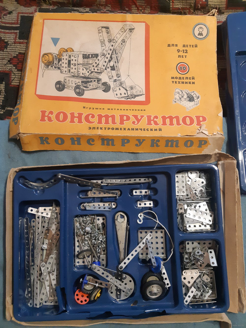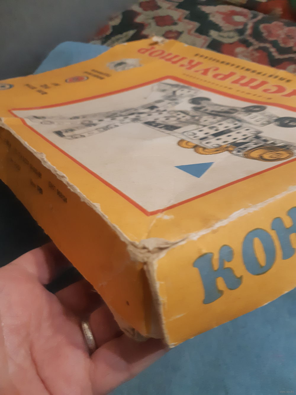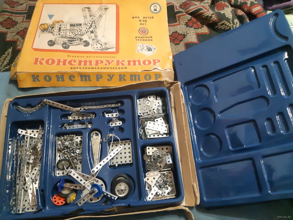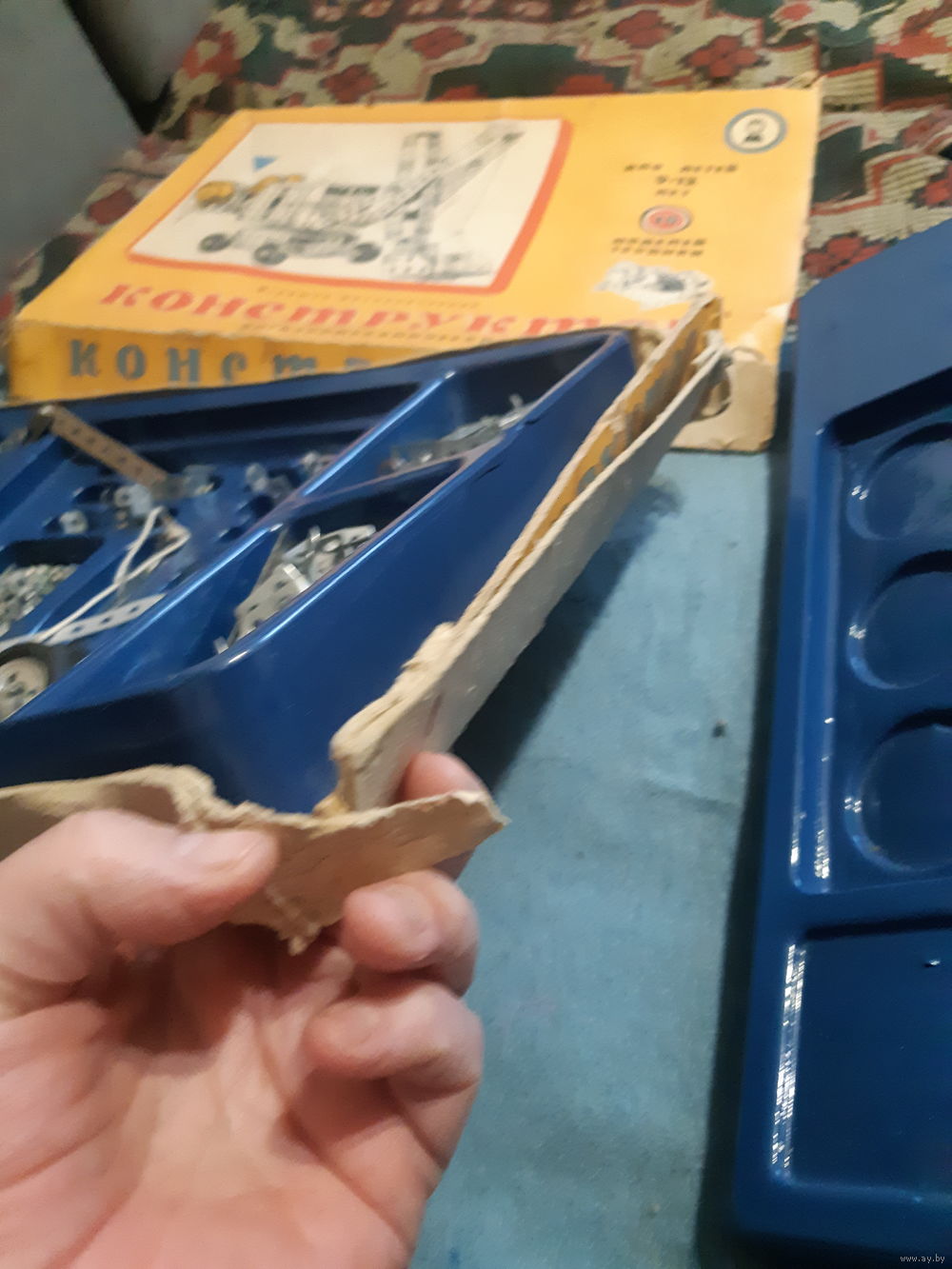 Коробка повреждена, смотрите фото. Деталей много, сколько должно быть - не знаю, инструкции нет.