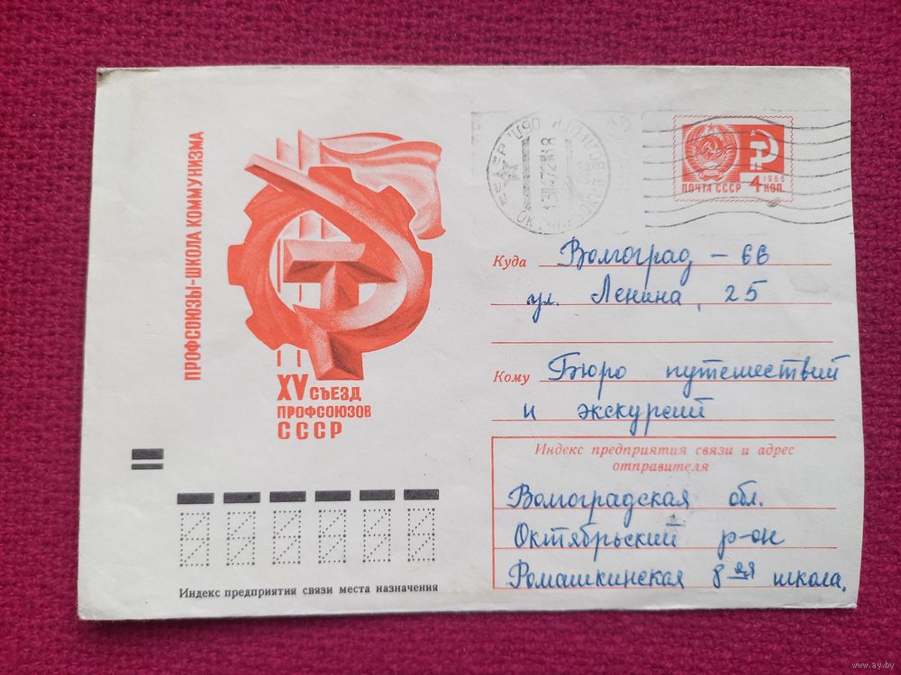 Конверт. 15 съезд профсоюзов СССР. Арцименев 1972 г.