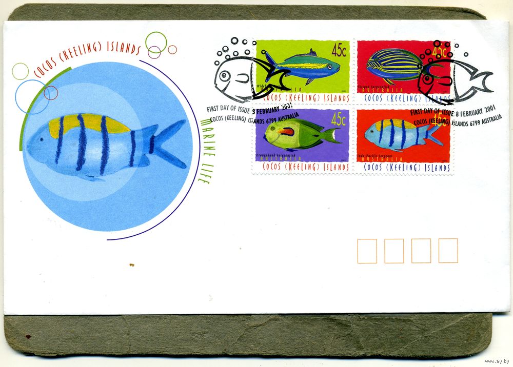КОНВЕРТ КОКОСОВЫЕ ОСТРОВА, КПД, 2004 жизнь моря марки серия Mi 404-407, 4 евро