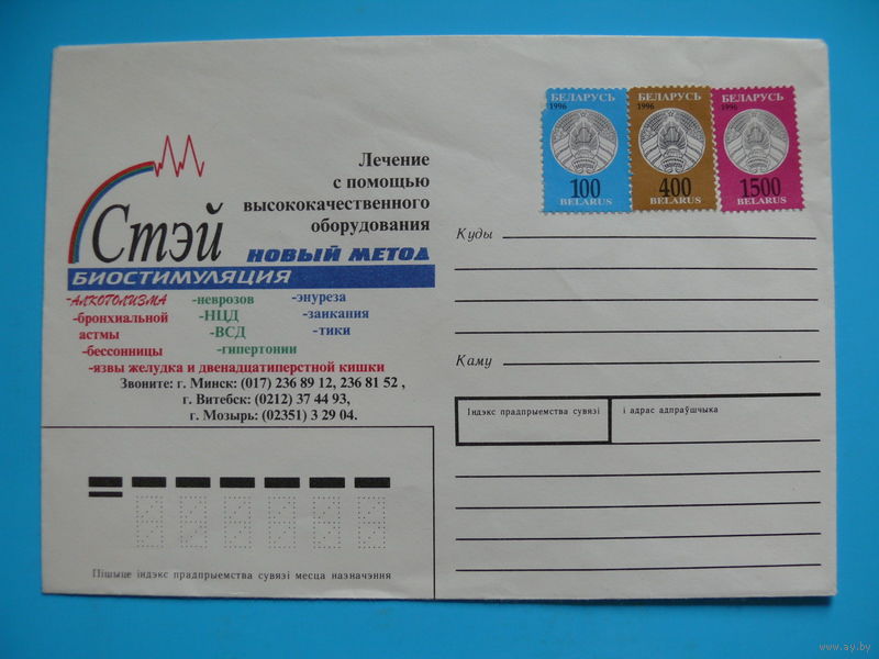 Конверт немаркированный, рекламный, Мед.центр "Стэй", 1996, Белпочта, чистый.