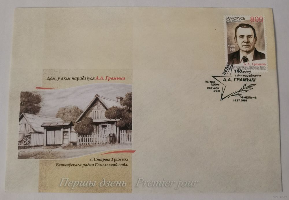 18 июля 2009 года Министерство связи и информатизации Республики Беларусь вводит в почтовое обращение марку «100 лет со дня рождения А. А. Громыко».Художник Николай Рыжий. Печать офсетная, полноцветная. Бумага мелованная, гуммированная. Зуб. греб. 13 3/4: 13 1/2. Размер марки 26х37 мм. Тираж марки 60,0 тыс. На марке применены элементы защиты. Историческая справка.Андрей Андреевич Громыко (5 июля 1909, д. Старые Громыки, Беларусь — 2 июля 1989) — выдающийся дипломат ХХ века, министр иностранных дел СССР, государственный иполитический деятель. А. А. Громыко принял непосредственное участие в создании Организации Объединенных Наций и подписал от имени СССР Устав ООН на конференции в Сан-Франциско (1945). В течение многих лет он использовал свое дипломатическое искусство для заключения целого ряда соглашений о разоружении, которые и по сей день остаются фундаментом международной структуры мира.