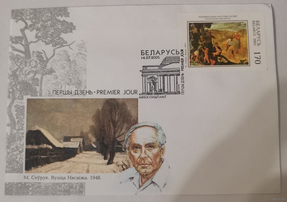 Национальный художественный музей Республики Беларусь (марка № 619 «М. Севрук. Жатва. 1937», конверт «Первый день», штемпель спецгашения).