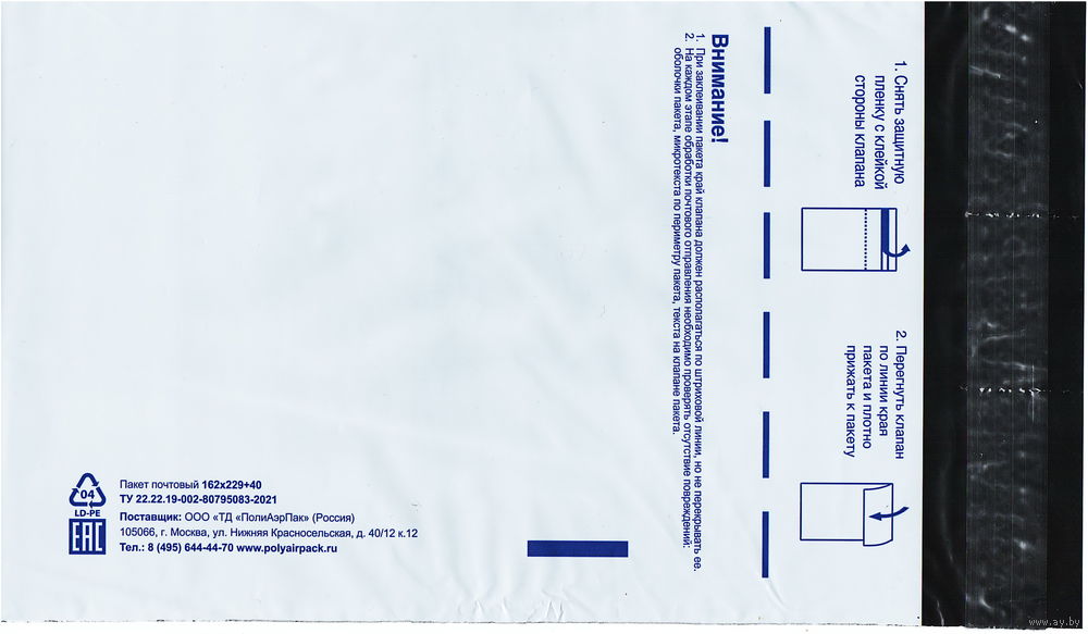 Конверт почтовый пластиковый 65 мкм с клеевым клапаном и адресной сеткой 162х229 мм