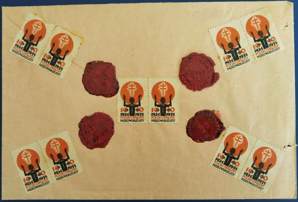 Оригинальный конверт с марками Польского противотуберкулезного союза, в хорошем состоянии. На сургучных печатях Drukarnia Ludwik Wiśniewski we Lwowie. В конверте находилось завещание владельца этой типографии.