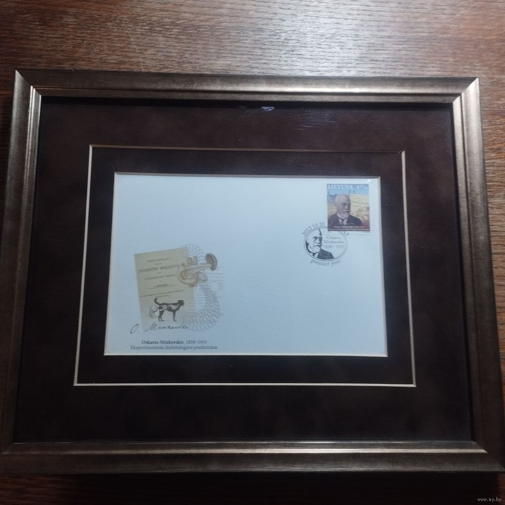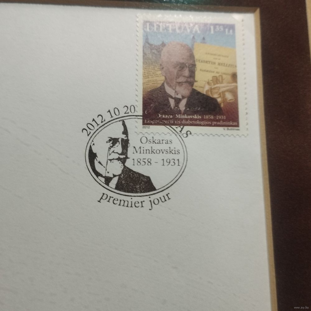 Конверт с маркой первого дня (КПД) из Литвы, выпущенный в честь Оскара Минковского, пионера экспериментальной диабетологии.