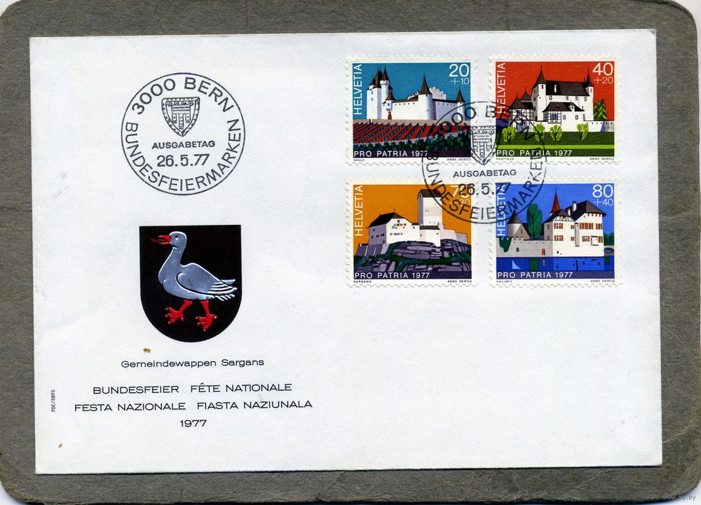 КОНВЕРТ ШВЕЙЦАРИЯ, КПД, АРХИТЕКТУРА, ЗАМКИ, 4м михель 1096-99,1977