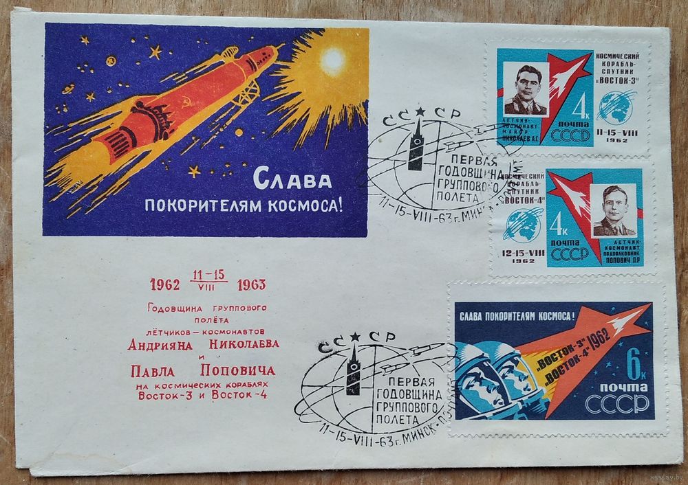 Конверт. Слава покорителям космоса. Надпечатка: Годовщина группового полета Николаева и Поповича. 1963 г. Издание министерства связи БССР. Чистый. Марки. Спецгашение