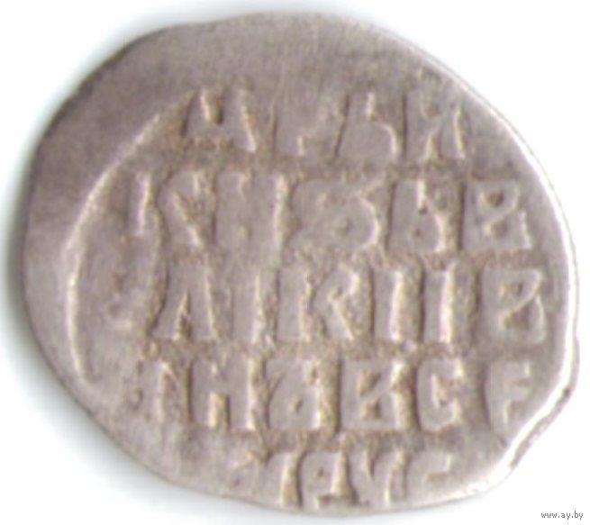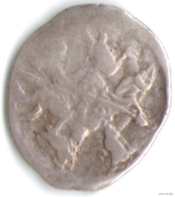 ГКХ 6. Объединённая северо-восточная Русь - Государь всея Руси Иван IV Васильевич Грозный. Копейка. Чеканка в Новгороде. Датировка ~1547-1584. Средний вес 0.68 гр.. В.Н. Клещинова, И.В. Гришина, №# 77. Л.ст.: Всадник в плаще с копьем скачет вправо. Буквы ПС под конём. Об.ст.: Русская легенда.