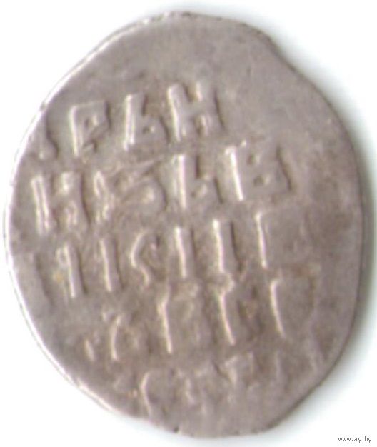 ГКХ 6. Объединённая северо-восточная Русь - Государь всея Руси Иван IV Васильевич Грозный. Копейка. Чеканка в Новгороде. Датировка ~1547-1584. Средний вес 0.68 гр.. В.Н. Клещинова, И.В. Гришина, №# 77. Л.ст.: Всадник в плаще с копьем скачет вправо. Буквы ПС под конём. Об.ст.: Русская легенда.
